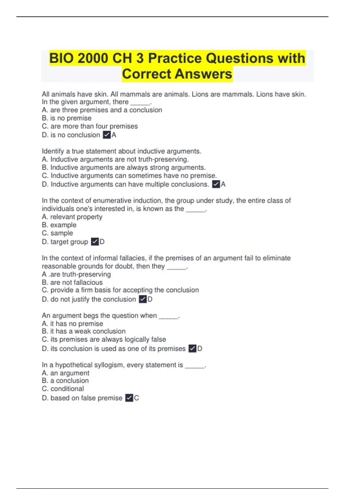 All animals have skin. All mammals are animals. Lions are mammals. Lions have skin. In the given argument, there _____. A. are three premises and a conclusion B. is no premise C. are more than four premises D. is no conclusion A Identify a true statement about inductive arguments. A. Inductive arguments are not truth-preserving. B. Inductive arguments are always strong arguments. C. Inductive arguments can sometimes have no premise. D. Inductive arguments can have multiple conclusions. A In the context of enumerative induction, the group under study, the entire class of individuals one's interested in, is known as the _____. A. relevant property B. example C. sample D. target group D In the context of informal fallacies, if the premises of an argument fail to eliminate reasonable grounds for doubt, then they _____. A .are truth-preserving B. are not fallacious C. provide a firm basis for accepting the conclusion D. do not justify the conclusion D An argument begs the question when _____. A. it has no premise B. it has a weak conclusion C. its premises are always logically false D. its conclusion is used as one of its premises D In a hypothetical syllogism, every statement is _____. A. an argument B. a conclusion C. conditional D. based on false premise C