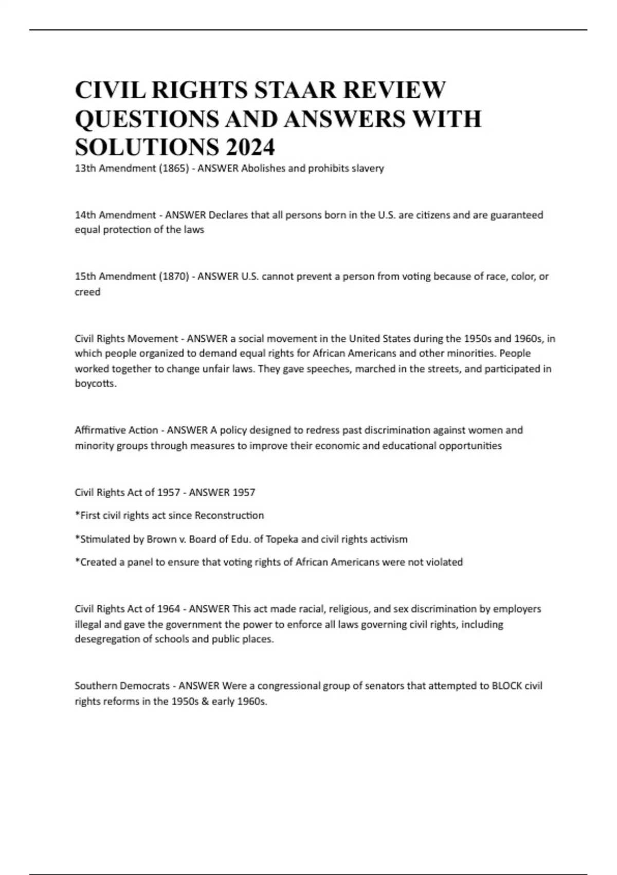 CIVIL RIGHTS STAAR REVIEW QUESTIONS AND ANSWERS WITH SOLUTIONS 2024