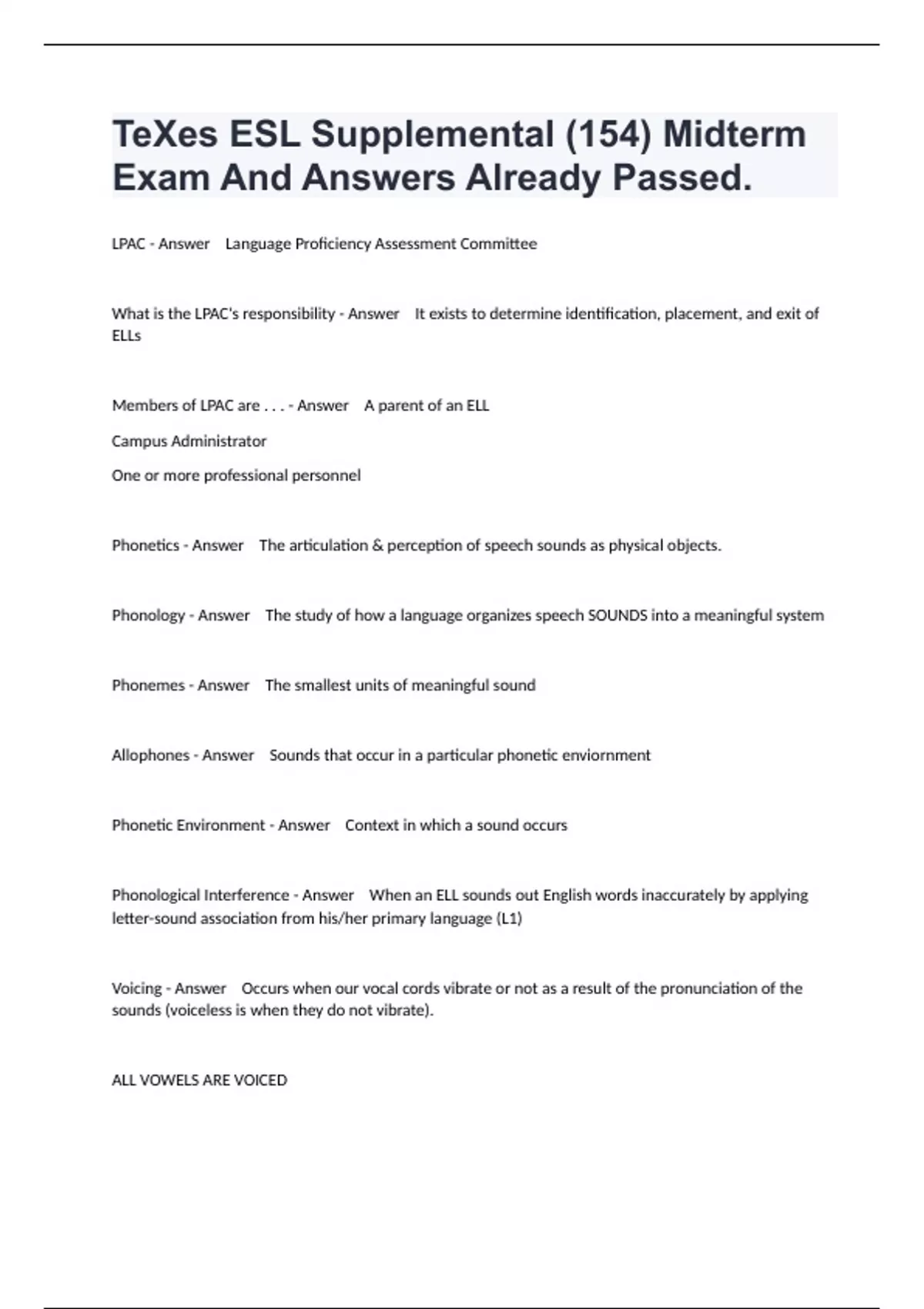TeXes ESL Supplemental (154) Midterm Exam And Answers Already Passed.