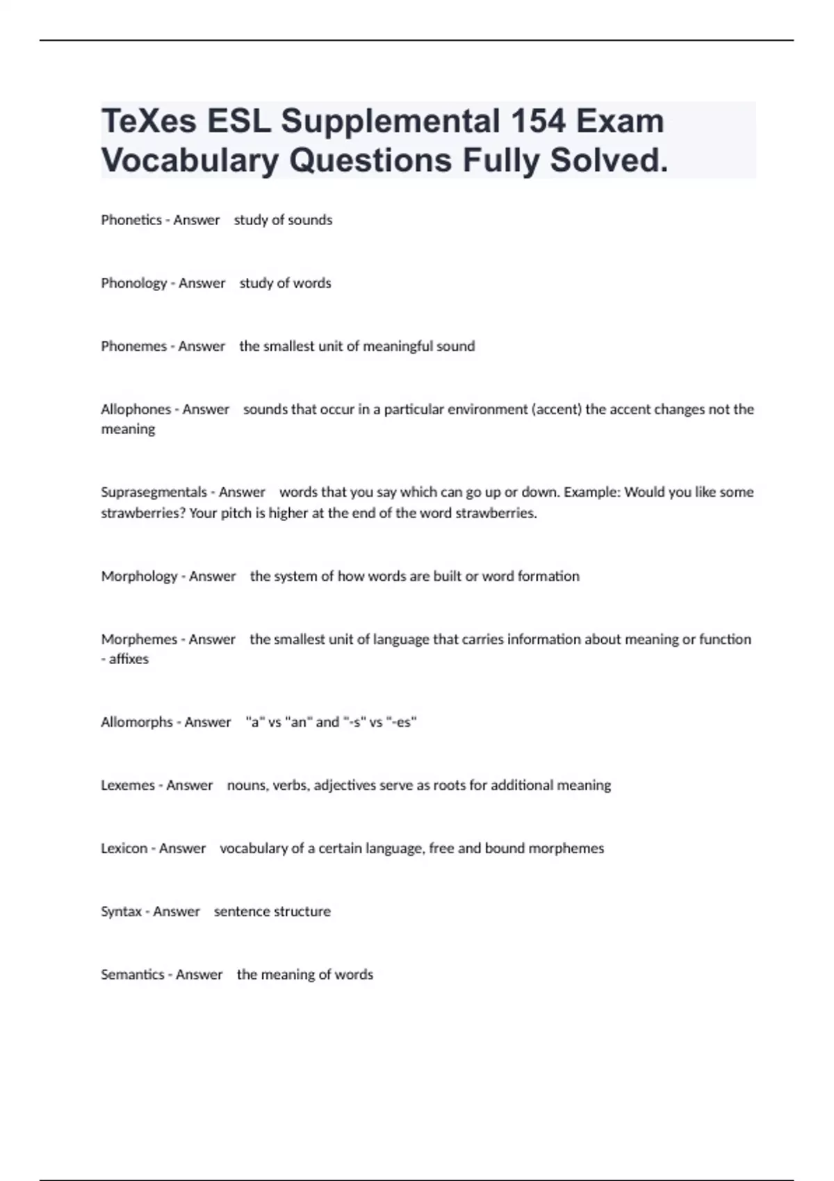 TeXes ESL Supplemental 154 Exam Vocabulary Questions Fully Solved.