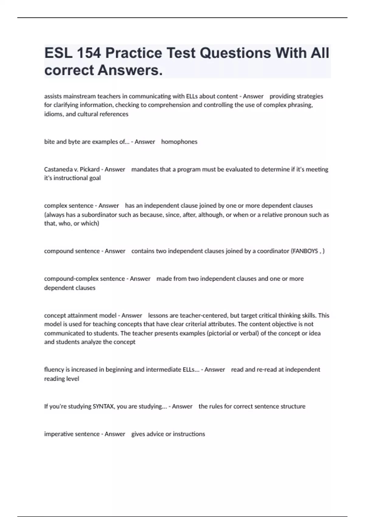 ESL 154 Practice Test Questions With All correct Answers.