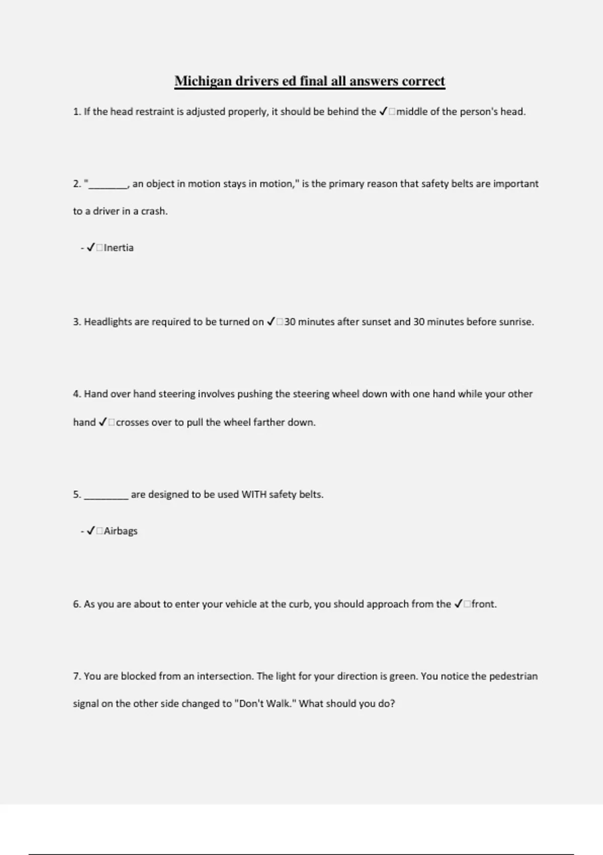 Michigan drivers ed final all answers correct 1. If the head restraint is adjusted properly, it should be behind the ️middle of the person's head. 2. "_______, an object in motion stays in motion," is the primary reason that safety belts are important to a driver in a crash. - ️Inertia 3. Headlights are required to be turned on ️30 minutes after sunset and 30 minutes before sunrise. 4. Hand over hand steering involves pushing the steering wheel down with one hand while your other hand ️crosses over to pull the wheel farther down. 5. ________ are designed to be used WITH safety belts. - ️Airbags 6. As you are about to enter your vehicle at the curb, you should approach from the ️front. 7. You are blocked from an intersection. The light for your direction is green. You notice the pedestrian signal on the other side changed to "Don't Walk." What should you do? - ️Prepare to stop because the light will turn yellow.A traffic light that has been green for some time is likely to do what? likely to turn yellow An intersection that has signs or signals to assign the right of way is called a _____ intersection Controlled The speed limit for a buisness district is 25 mph When you are first in line and the light turns green, you should check the areas____, _________, and _______ of your vehicle before moving ahead Left, right, front Rumble strips are placed across the road to alert drivers they are approaching what? A change of roadway conditions, hazzard A pennant-shaped sign means No passing zone When approaching a railroad crossing that had gates lowered with signals flashing and bells ringing, you should stop and wait until the gates are ______, the signals ______ flashing, and the bells stop ringing Raised, stop, ringing What do you do at an intersection with a flashing red light Stop, then proceed when clear A double yellow line in the middle of a two lane road means No passing in either direction When stopped at a red signal light, which then changes to green, you should Look before going A solid yellow line next to a broken yellow line means that vehicles next to the broken line May pass when safe When driving in city traffic you should check traffic signals at least One block ahead You must stop at the intersection ahead. Just before the intersection there are railroad tracks, you should Stop before you cross the railroad tracks then make sure you have room to completely cross the tracks When preparing to make a three point turnaround, you should first Pull to the right and stop When a vehicle blocks your view of the road ahead, it is best to Follow at a greater distance than usual If you must leave the roadway at a high speed and no open space is available, you should