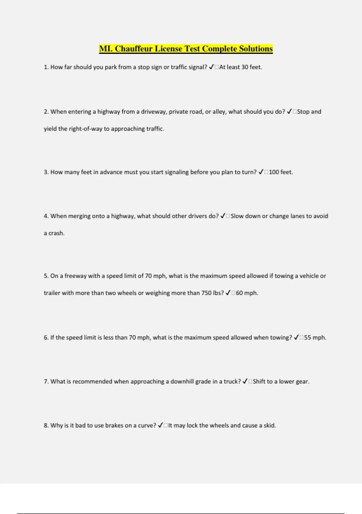 MI. Chauffeur License Test Complete Solutions 1. How far should you park from a stop sign or traffic signal? ️At least 30 feet. 2. When entering a highway from a driveway, private road, or alley, what should you do? ️Stop and yield the right-of-way to approaching traffic. 3. How many feet in advance must you start signaling before you plan to turn? ️100 feet. 4. When merging onto a highway, what should other drivers do? ️Slow down or change lanes to avoid a crash. 5. On a freeway with a speed limit of 70 mph, what is the maximum speed allowed if towing a vehicle or trailer with more than two wheels or weighing more than 750 lbs? ️60 mph. 6. If the speed limit is less than 70 mph, what is the maximum speed allowed when towing? ️55 mph. 7. What is recommended when approaching a downhill grade in a truck? ️Shift to a lower gear. 8. Why is it bad to use brakes on a curve? ️It may lock the wheels and cause a skid. Following vehicle to closely depending on size of truck it may be what ? ️illegal vehicles with a gross weight of 5,000 pounds loaded or unloaded must not follow each other closer than _ ? ️500 ft. To provide time to react to changes in traffic you should look ahead how many seconds worth of travel time? ️12 seconds If a load extends 4 feet or more past the rear of a vehicle bed or body what must be displayed ? ️red flag, big red light or cloth 12 in square What is maximum height of vehicles for Michigan roads and highways is ? ️13 feet and