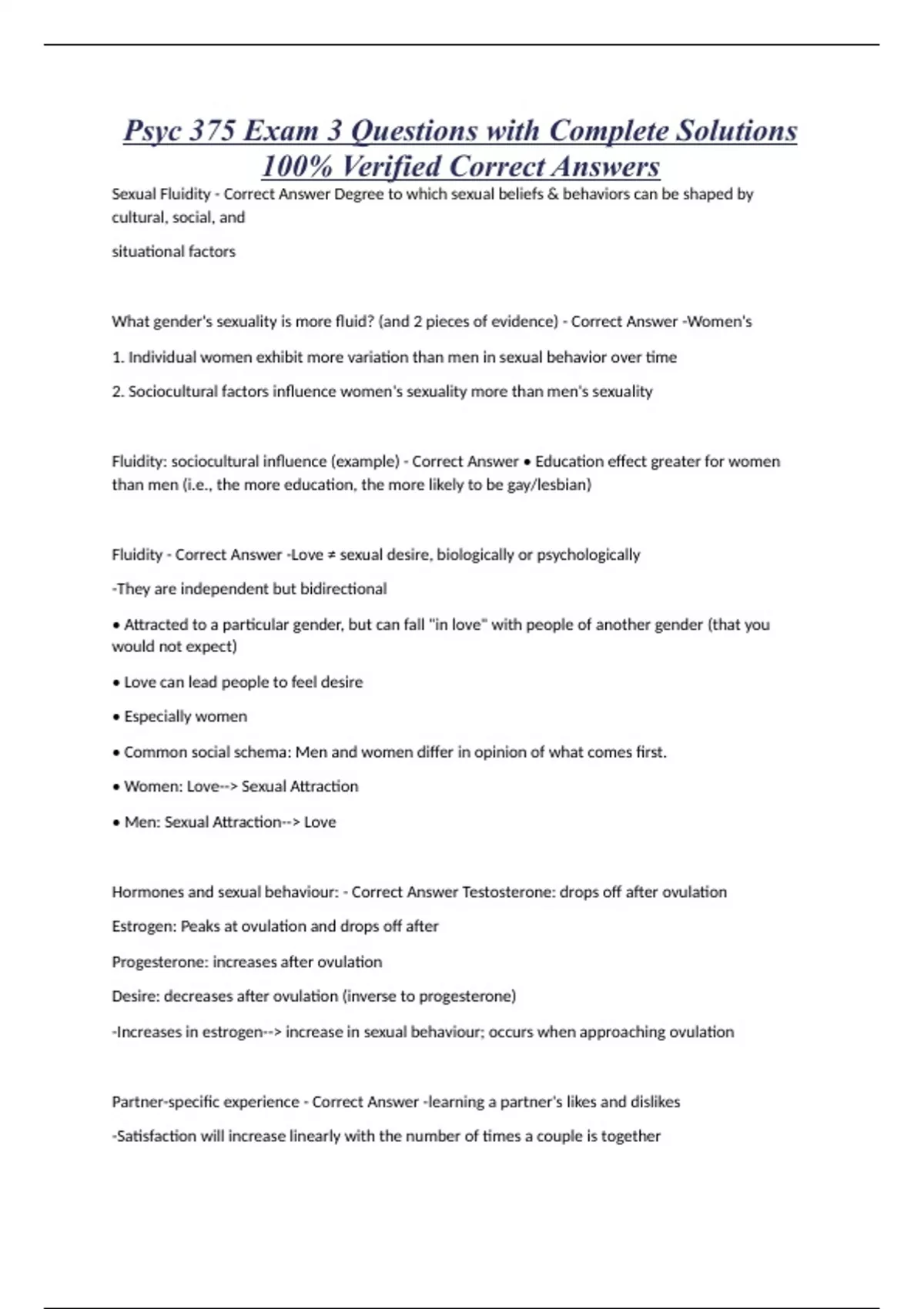 Psyc 375 Exam 3 Questions with Complete Solutions 100% Verified Correct Answers Sexual Fluidity - Correct Answer Degree to which sexual beliefs & behaviors can be shaped by cultural, social, and situational factors What gender's sexuality is more fluid? (and 2 pieces of evidence) - Correct Answer -Women's 1. Individual women exhibit more variation than men in sexual behavior over time 2. Sociocultural factors influence women's sexuality more than men's sexuality Fluidity: sociocultural influence (example) - Correct Answer • Education effect greater for women than men (i.e., the more education, the more likely to be gay/lesbian) Fluidity - Correct Answer -Love ≠ sexual desire, biologically or psychologically -They are independent but bidirectional • Attracted to a particular gender, but can fall "in love" with people of another gender (that you would not expect) • Love can lead people to feel desire • Especially women • Common social schema: Men and women differ in opinion of what comes first. • Women: Love--> Sexual Attraction • Men: Sexual Attraction--> Love Hormones and sexual behaviour: - Correct Answer Testosterone: drops off after ovulation Estrogen: Peaks at ovulation and drops off after Progesterone: increases after ovulation Desire: decreases after ovulation (inverse to progesterone) -Increases in estrogen--> increase in sexual behaviour; occurs when approaching ovulation Partner-specific experience - Correct Answer -learning a partner's likes and dislikes -Satisfaction will increase linearly with the number of times a couple is together Graph:Most likely to orgasm during a sexual event in a relationship >6months; compared to hookup conditions Predictors of straight women's sexual satisfaction - Correct Answer • Gender inequality • Women's pleasure is not acceptable during hookup-sex, but women's pleasure is acceptable during relationship-sex • Partners will focus