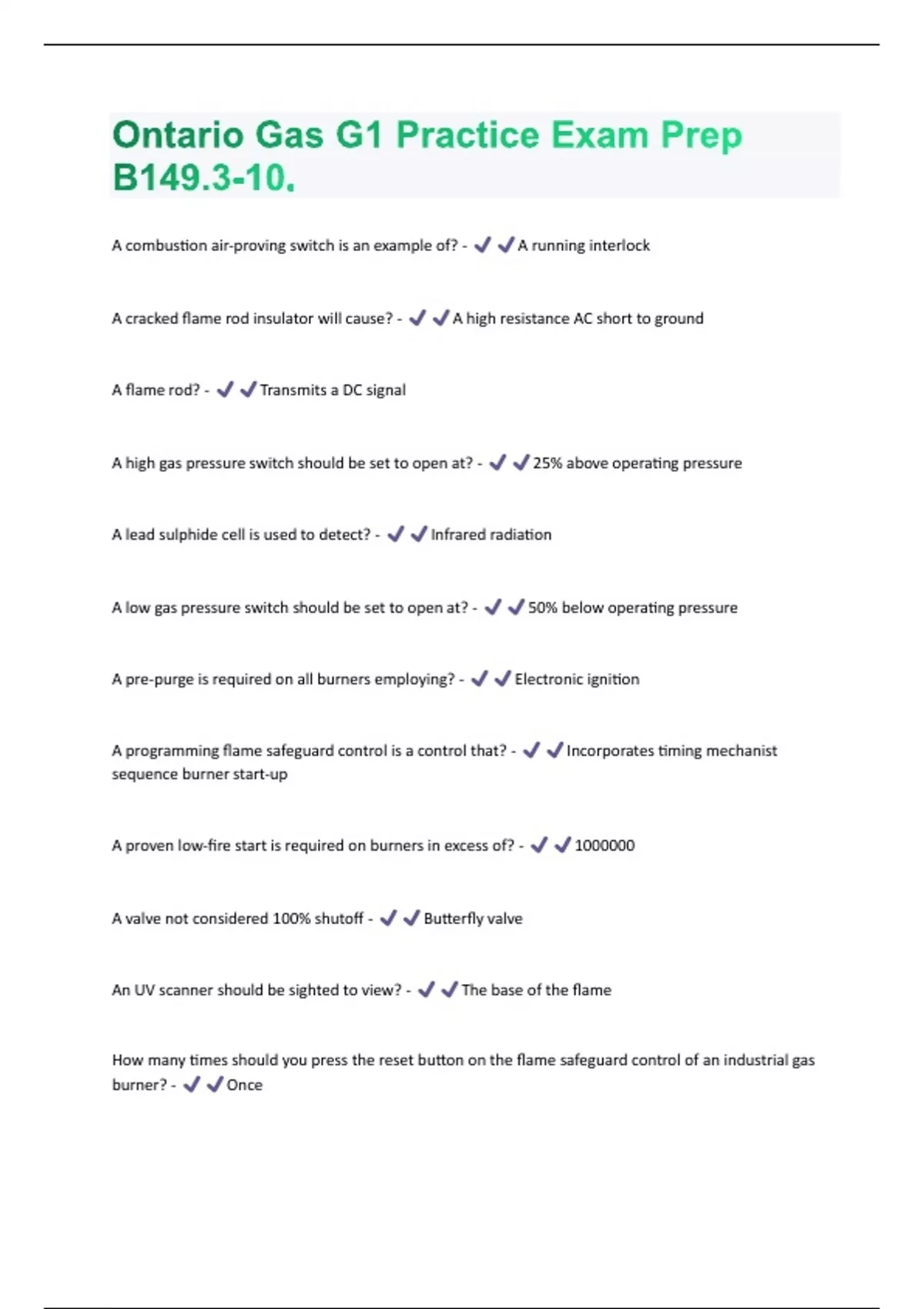 A combustion air-proving switch is an example of? - A running interlock A cracked flame rod insulator will cause? - A high resistance AC short to ground A flame rod? - Transmits a DC signal A high gas pressure switch should be set to open at? - 25% above operating pressure A lead sulphide cell is used to detect? - Infrared radiation A low gas pressure switch should be set to open at? - 50% below operating pressure A pre-purge is required on all burners employing? - Electronic ignition A programming flame safeguard control is a control that? - Incorporates timing mechanist sequence burner start-up A proven low-fire start is required on burners in excess of? - 1000000 A valve not considered 100% shutoff - Butterfly valve An UV scanner should be sighted to view? - The base of the flame How many times should you press the reset button on the flame safeguard control of an industrial gas burner? - OnceIf an industrial gas burner employs a flame rectification system, the area of the ground plate must be? - 4x the area of the flame rod If the combustion air switch opens during the start-up of an industrial gas burner you should? - Check the air supply delivery system The "Bleed" valve on a double block&bleed system is required on an appliance firing over? - The maximum flame failure response time allowed on a gas appliance firing seconds The minimum required pre-purge on an industrial gas-fired appliance? - 4x the volume of the combustion zone&flue passages What is the first action 'to be taken when performing an ignition spark response test? - Close test firing valve and pilot valve What is the first thing you must do when using flame simulator on an industrial gas burner? - Close test firing valve What provides the opening force on a diaphragm valve? - Upstream gas pressure What provides the opening force on a regulator? - Spring tension When using an UV flame detector a false flame signal may be produced by? - Ignition spark Where is the high pressure switch to be located on the valve train? - After the second "blocking" valveWhere is the low pressure switch located on the valve train? - After the main gas regulator