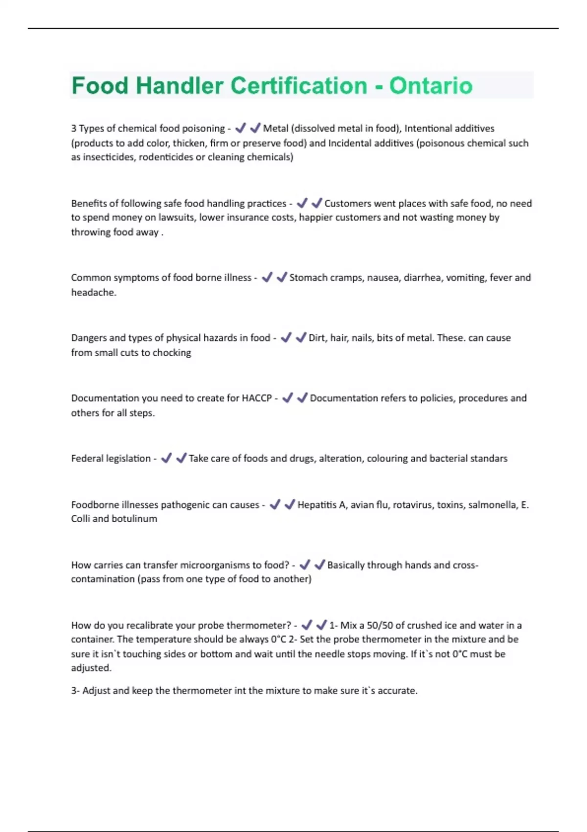 Food Handler Certification - Ontario Questions And Answers With Verified Study Solutions Rated A+