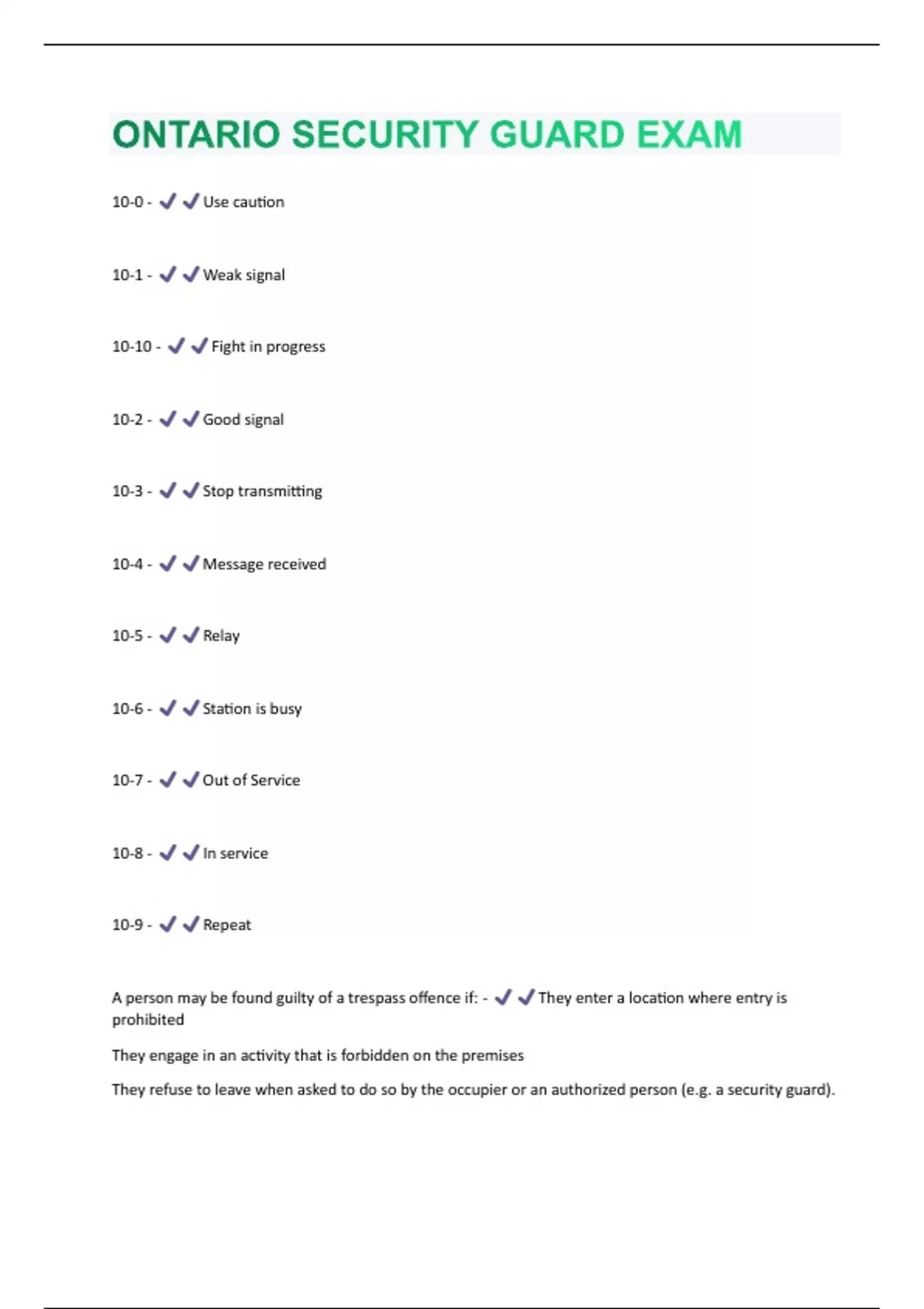 10-0 - Use caution 10-1 - Weak signal 10-10 - Fight in progress 10-2 - Good signal 10-3 - Stop transmitting 10-4 - Message received 10-5 - Relay 10-6 - Station is busy 10-7 - Out of Service 10-8 - In service 10-9 - Repeat A person may be found guilty of a trespass offence if: - They enter a location where entry is prohibited They engage in an activity that is forbidden on the premises They refuse to leave when asked to do so by the occupier or an authorized person (e.g. a security guard).Criminal Law - A system of law concerned with the punishment of those who commit crimes. How would a security guard make an arrest under the trespass to property act? - A security guard can make an arrest without warrant when an individual is caught violating the trespass to property act. After making the arrest, police must be called and the individual will be handed over to a police officer. Majority of tasks assigned to security professionals is to.... - Deter, observe, record, and report. Municipal By-Law - A by-law is a form of legislation established by local government to resolve issues and address the needs of citizens Name the main 4 requirements in order to obtain a security license. - Must be 18 years old Must be entitled to work in Canada Must posses a clean criminal record Must have completed the required training and/or testing Provincial Law - A set of laws created by a province which includes property rights, natural resources, education, social services, housing, health law, and family law. Section 34 (3.2) of Liquor License Act - No re-entry: No person shall re-enter the licensed premises on the same day he or she is required to vacate unless authorized to re-enter by a police officer. Section 35 (1) of the PSISA states... - Any person that is acting or holding themselves out as a security guard must: Carry their license On request, must identify themselves as a security guard And/ or on request, produce their licenseSection 39 of the PSISA states... - No person who holds a security guard license may act or state they are the police. (This includes private investigators) The role of a security guard is.... - Protect people, property, and information True or False: According to the PSISA code of conduct, a security guard must refrain from using excessive use of force unless they feel the person is a threat to the public. - True True or False: According to the PSISA code of conduct, road rules such as obeying stop signs and traffic lights do not apply as a security guard when chasing or following someone who you may think committed a crime. - False True or False: A security guard uniform must contain their rank and reflective stripes on the pants to be seen from traffic. - False What is the individual punishment for contravening the PSISA? - $25,000 fine, imprisonment for up to one year or both What is the punishment a business can face for contravening the PSISA? - $250,000 fine