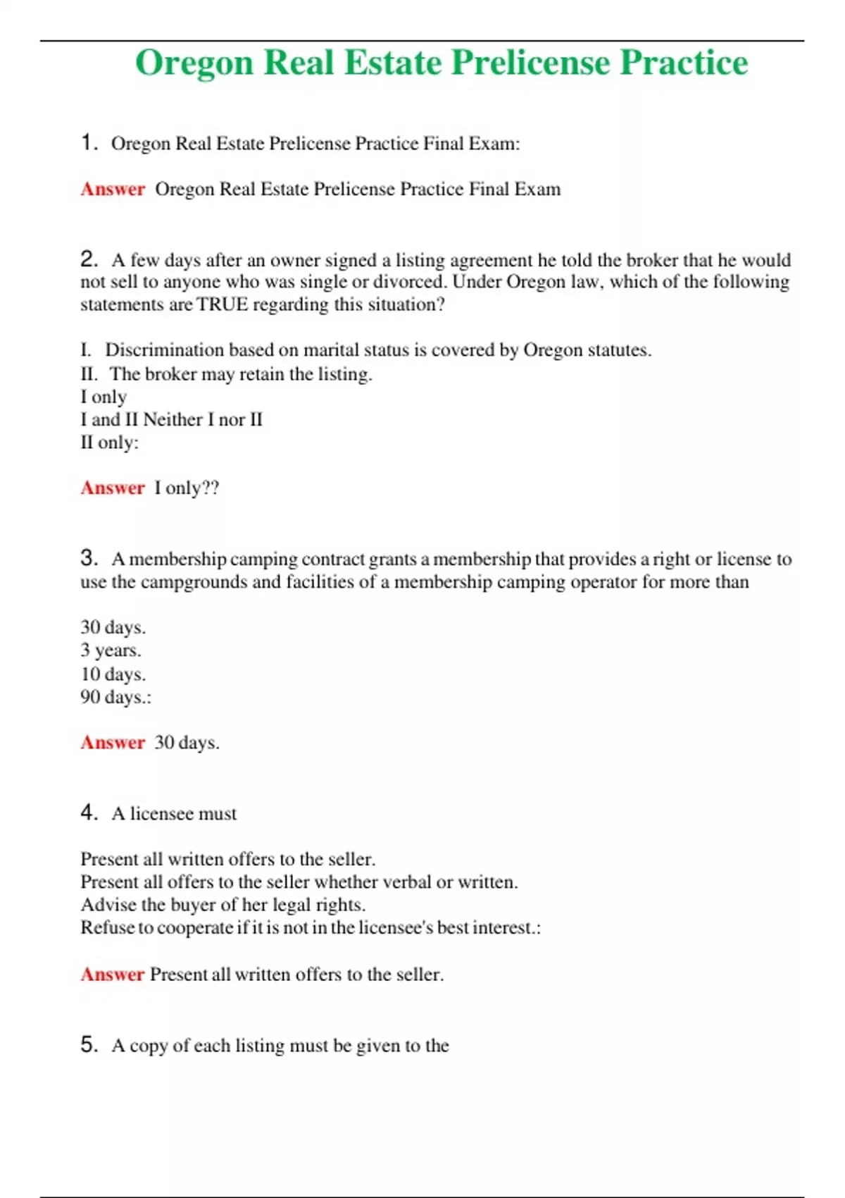 Oregon Real Estate Prelicense Practice (Latest 2024) Questions With Complete Grade A+ Answers