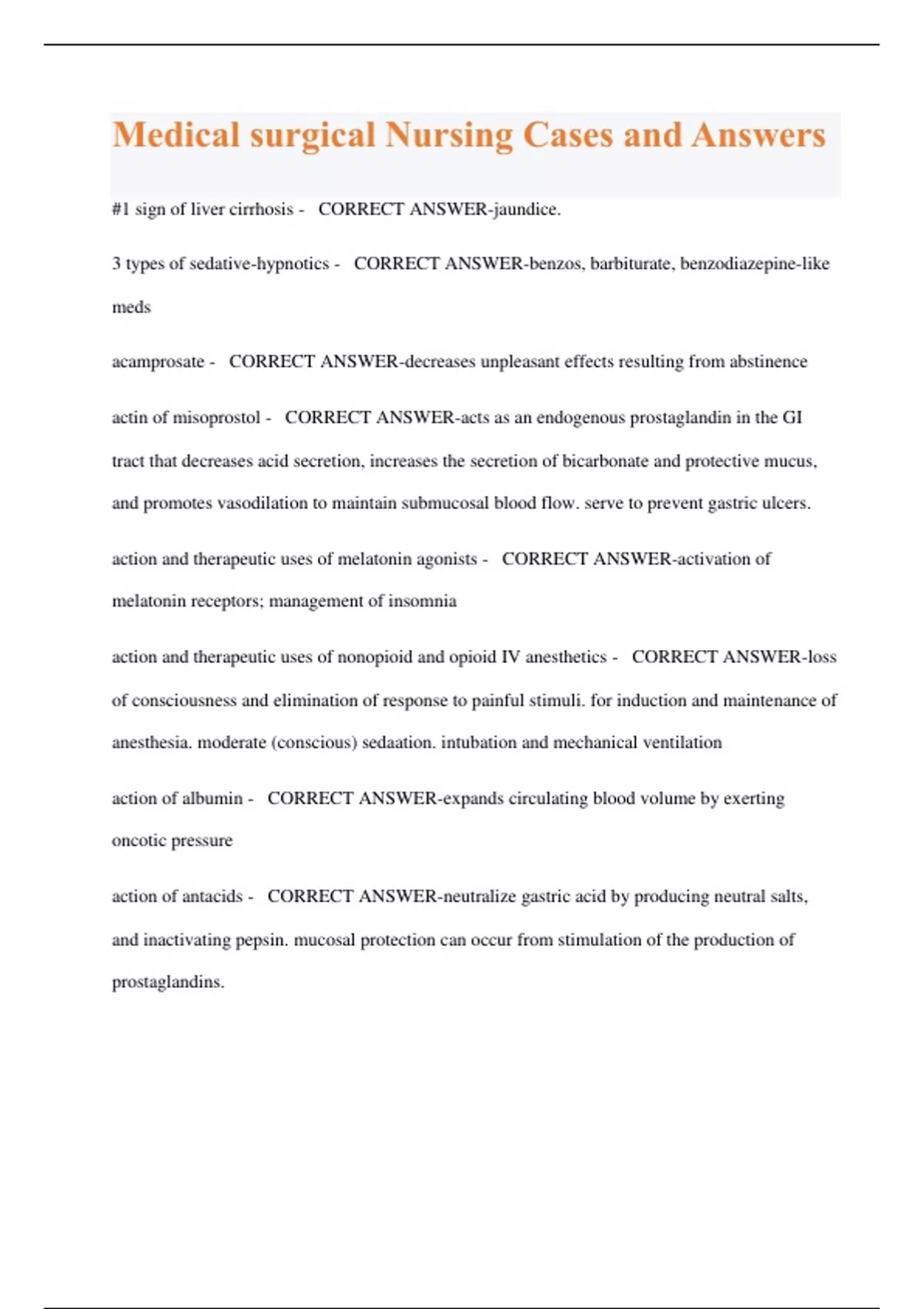 Medical surgical Nursing Cases and Answers #1 sign of liver cirrhosis - CORRECT ANSWER-jaundice. 3 types of sedative-hypnotics - CORRECT ANSWER-benzos, barbiturate, benzodiazepine-like meds acamprosate - CORRECT ANSWER-decreases unpleasant effects resulting from abstinence actin of misoprostol - CORRECT ANSWER-acts as an endogenous prostaglandin in the GI tract that decreases acid secretion, increases the secretion of bicarbonate and protective mucus, and promotes vasodilation to maintain submucosal blood flow. serve to prevent gastric ulcers. action and therapeutic uses of melatonin agonists - CORRECT ANSWER-activation of melatonin receptors; management of insomnia action and therapeutic uses of nonopioid and opioid IV anesthetics - CORRECT ANSWER-loss of consciousness and elimination of response to painful stimuli. for induction and maintenance of anesthesia. moderate (conscious) sedaation. intubation and mechanical ventilation action of albumin - CORRECT ANSWER-expands circulating blood volume by exerting oncotic pressure action of antacids - CORRECT ANSWER-neutralize gastric acid by producing neutral salts, and inactivating pepsin. mucosal protection can occur from stimulation of the production of prostaglandins