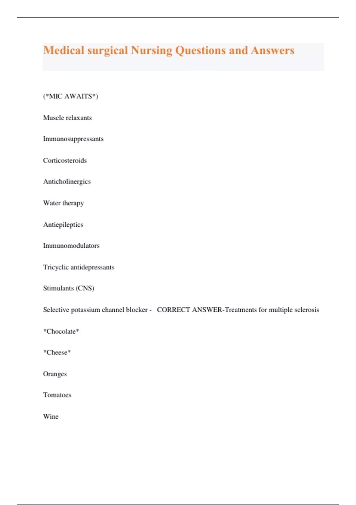 Medical surgical Nursing Questions and Answers (*MIC AWAITS*) Muscle relaxants Immunosuppressants Corticosteroids Anticholinergics Water therapy Antiepileptics Immunomodulators Tricyclic antidepressants Stimulants (CNS) Selective potassium channel blocker - CORRECT ANSWER-Treatments for multiple sclerosis *Chocolate* *Cheese* Oranges Tomatoes Wine Onions - CORRECT ANSWER-Foods that may cause a migraine headache 1 minutes to 1 hour beforehand - CORRECT ANSWER-The aura phase of migraine headaches can occur at this time 1-2 flare-ups every 1-3 years - CORRECT ANSWER-Relapsing-remitting multiple sclerosis usually occurs at this rate 1-5 years - CORRECT ANSWER-Pain after a nerve block will return after this time 2-4 months - CORRECT ANSWER-Botox injections have anti-mirgraine effects for this long 20-30 years - CORRECT ANSWER-The onset for migraine headaches is this 25-30 years - CORRECT ANSWER-People with multiple sclerosis have a life expectancy of this 3-6 m