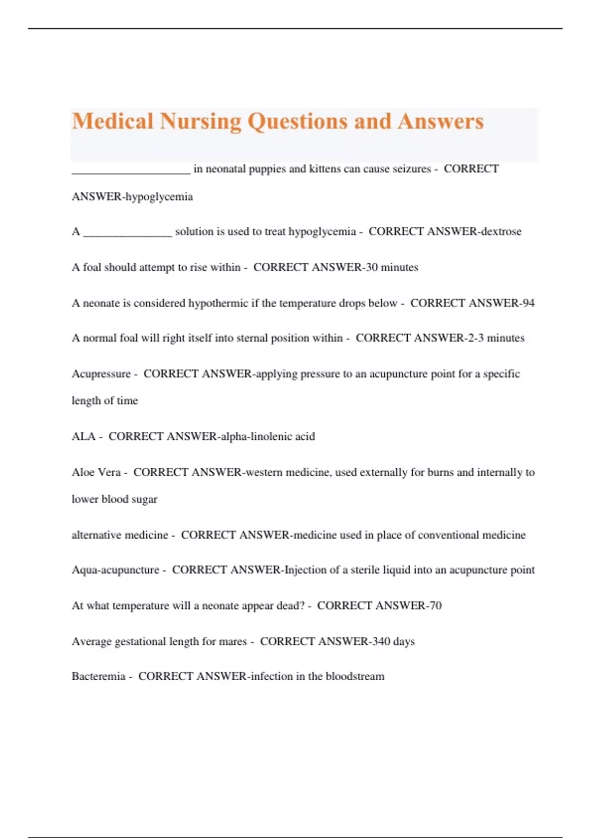 Medical Nursing Questions and Answers ____________________ in neonatal puppies and kittens can cause seizures - CORRECT ANSWER-hypoglycemia A _______________ solution is used to treat hypoglycemia - CORRECT ANSWER-dextrose A foal should attempt to rise within - CORRECT ANSWER-30 minutes A neonate is considered hypothermic if the temperature drops below - CORRECT ANSWER-94 A normal foal will right itself into sternal position within - CORRECT ANSWER-2-3 minutes Acupressure - CORRECT ANSWER-applying pressure to an acupuncture point for a specific length of time ALA - CORRECT ANSWER-alpha-linolenic acid Aloe Vera - CORRECT ANSWER-western medicine, used externally for burns and internally to lower blood sugar alternative medicine - CORRECT ANSWER-medicine used in place of conventional medicine Aqua-acupuncture - CORRECT ANSWER-Injection of a sterile liquid into an acupuncture point At what temperature will a neonate appear dead? - CORRECT ANSWER-70 Average gestational length for mares - CORRECT ANSWER-340 days Bacteremia - CORRECT ANSWER-infection in the bloodstream