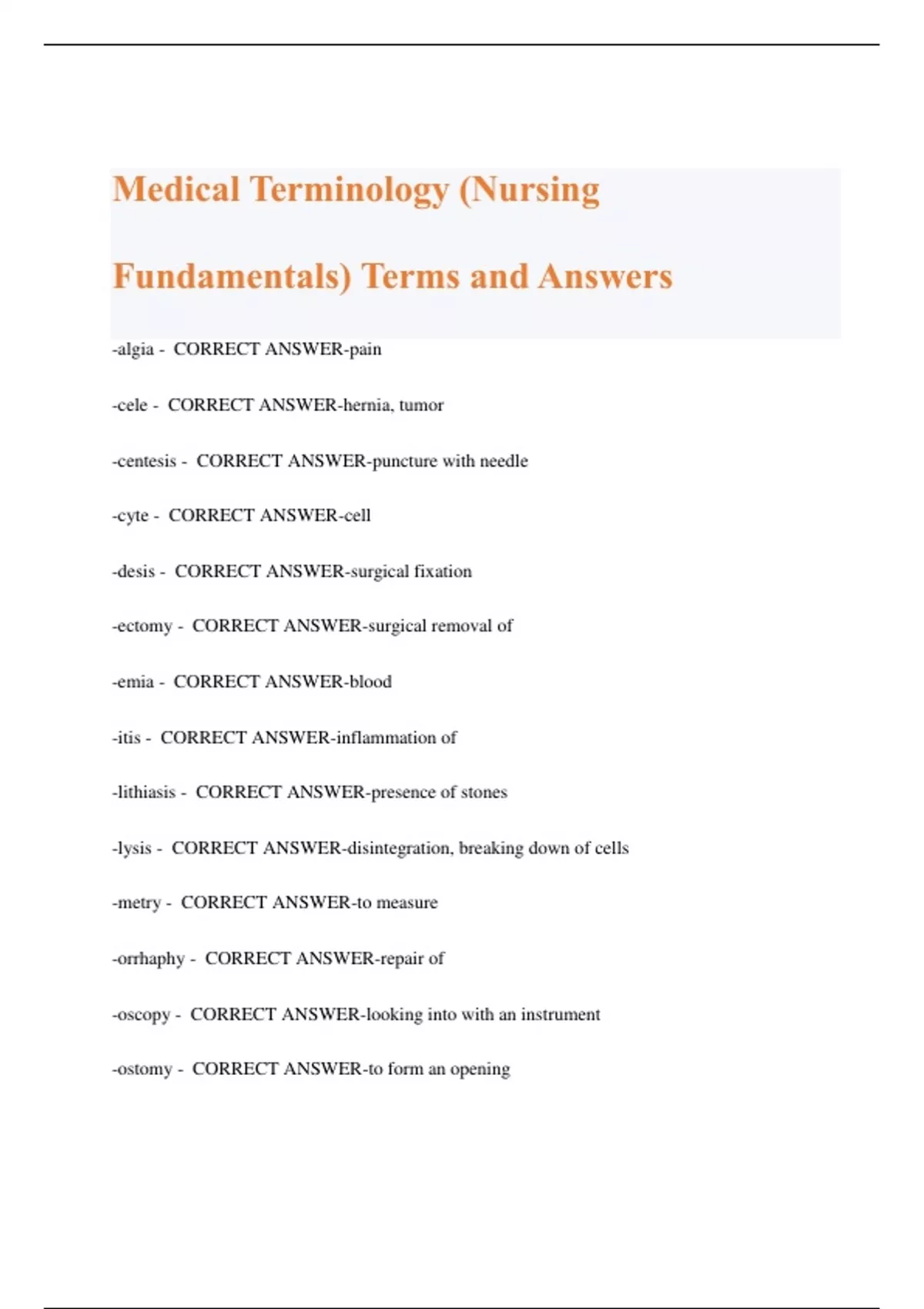 Medical Terminology (Nursing Fundamentals) Terms and Answers -algia - CORRECT ANSWER-pain -cele - CORRECT ANSWER-hernia, tumor -centesis - CORRECT ANSWER-puncture with needle -cyte - CORRECT ANSWER-cell -desis - CORRECT ANSWER-surgical fixation -ectomy - CORRECT ANSWER-surgical removal of -emia - CORRECT ANSWER-blood -itis - CORRECT ANSWER-inflammation of -lithiasis - CORRECT ANSWER-presence of stones -lysis - CORRECT ANSWER-disintegration, breaking down of cells -metry - CORRECT ANSWER-to measure -orrhaphy - CORRECT ANSWER-repair of -oscopy - CORRECT ANSWER-looking into with an instrument -ostomy - CORRECT ANSWER-to form an opening