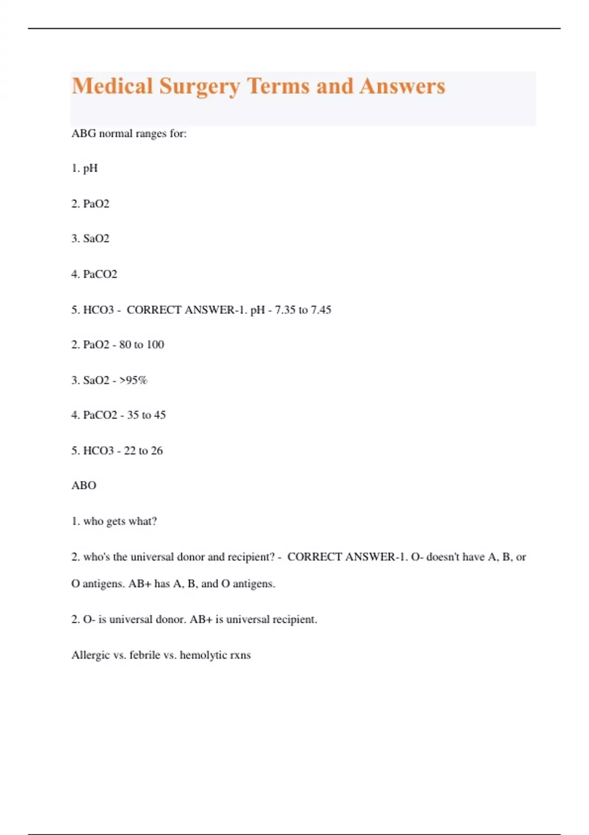 Medical Surgery Terms and Answers ABG normal ranges for: 1. pH 2. PaO2 3. SaO2 4. PaCO2 5. HCO3 - CORRECT ANSWER-1. pH - 7.35 to 7.45 2. PaO2 - 80 to 100 3. SaO2 - >95% 4. PaCO2 - 35 to 45 5. HCO3 - 22 to 26 ABO 1. who gets what? 2. who's the universal donor and recipient? - CORRECT ANSWER-1. O- doesn't have A, B, or O antigens. AB+ has A, B, and O antigens. 2. O- is universal donor. AB+ is universal recipient. Allergic vs. febrile vs. hemolytic rxns 1. Symptoms of each - CORRECT ANSWER-A. Allergic - facial flushing, hives/rash, increased anxiety, decreased BP, dyspnea B. Febrile - fever, chills, anxiety, headache, tachydardia, tachypnea C. Hemolytic - chest pain, low back back pain, fever, chills, tachycardia, apprehension, decreased BP, increased resp. rate
