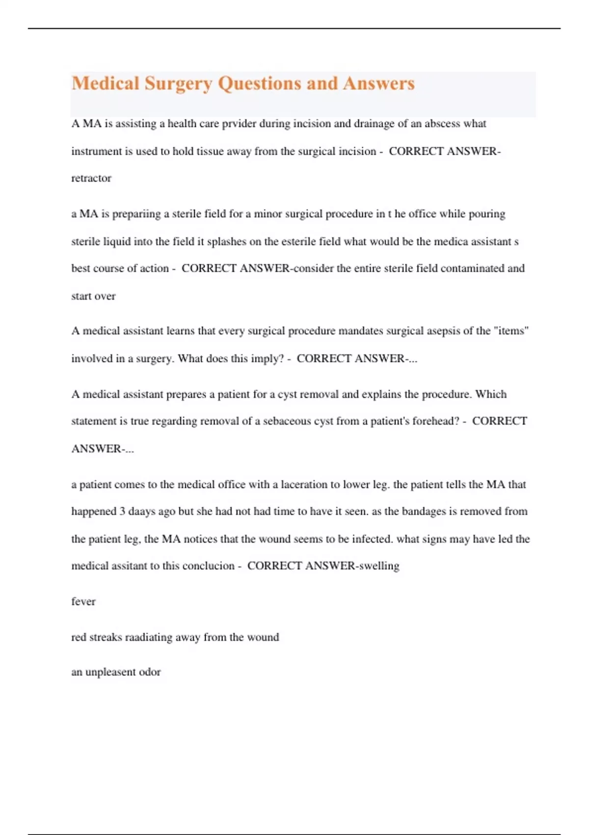 Medical Surgery Questions and Answers A MA is assisting a health care prvider during incision and drainage of an abscess what instrument is used to hold tissue away from the surgical incision - CORRECT ANSWERretractor a MA is prepariing a sterile field for a minor surgical procedure in t he office while pouring sterile liquid into the field it splashes on the esterile field what would be the medica assistant s best course of action - CORRECT ANSWER-consider the entire sterile field contaminated and start over A medical assistant learns that every surgical procedure mandates surgical asepsis of the "items" involved in a surgery. What does this imply? - CORRECT ANSWER-... A medical assistant prepares a patient for a cyst removal and explains the procedure. Which statement is true regarding removal of a sebaceous cyst from a patient's forehead? - CORRECT ANSWER-... a patient comes to the medical office with a laceration to lower leg. the patient tells the MA that happened 3 daays ago but she had not had time to have it seen. as the bandages is removed from the patient leg, the MA notices that the wound seems to be infected. what signs may have led the medical assitant to this conclucion - CORRECT ANSWER-swelling