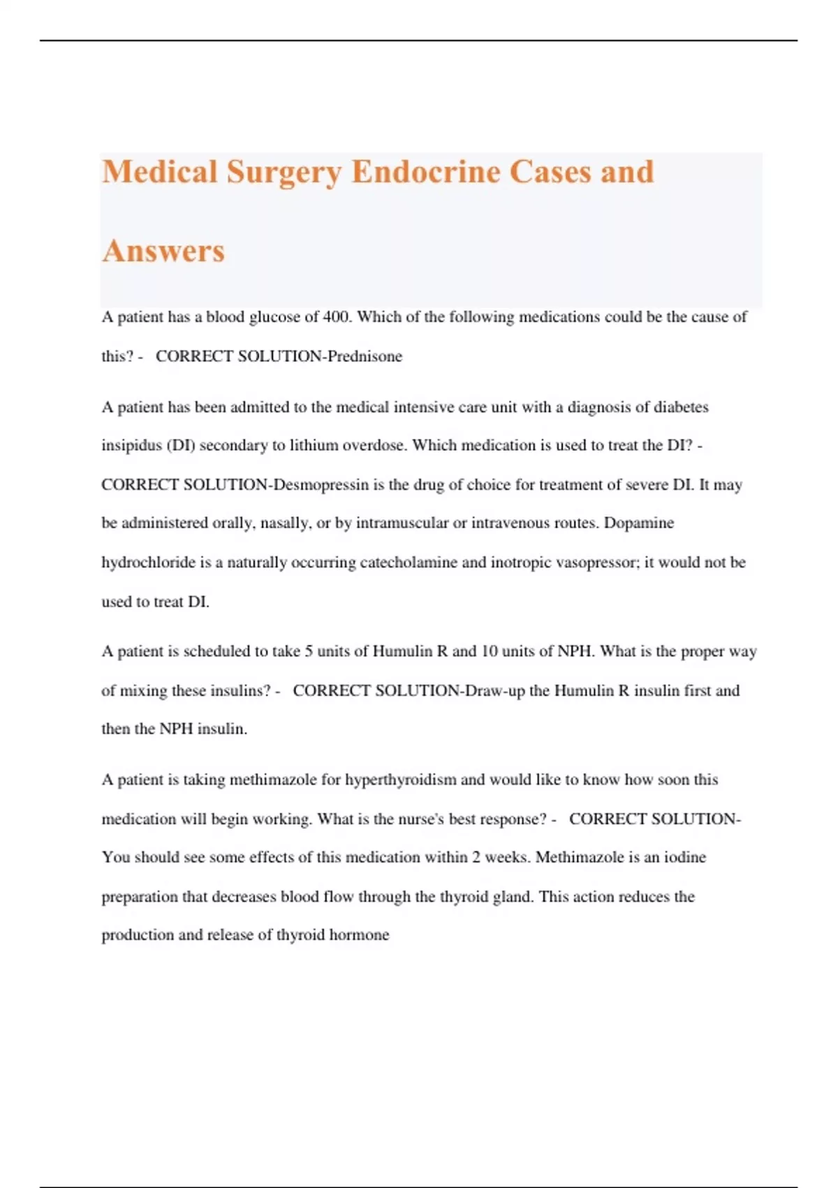 Medical Surgery Endocrine Cases and Answers A patient has a blood glucose of 400. Which of the following medications could be the cause of this? - CORRECT SOLUTION-Prednisone A patient has been admitted to the medical intensive care unit with a diagnosis of diabetes insipidus (DI) secondary to lithium overdose. Which medication is used to treat the DI? - CORRECT SOLUTION-Desmopressin is the drug of choice for treatment of severe DI. It may be administered orally, nasally, or by intramuscular or intravenous routes. Dopamine hydrochloride is a naturally occurring catecholamine and inotropic vasopressor; it would not be used to treat DI. A patient is scheduled to take 5 units of Humulin R and 10 units of NPH. What is the proper way of mixing these insulins? - CORRECT SOLUTION-Draw-up the Humulin R insulin first and then the NPH insulin. A patient is taking methimazole for hyperthyroidism and would like to know how soon this medication will begin working. What is the nurse's best response? - CORRECT SOLUTIONYou should see some effects of this medication within 2 weeks. Methimazole is an iodine preparation that decreases blood flow through the thyroid gland. This action reduces the production and release of thyroid hormone