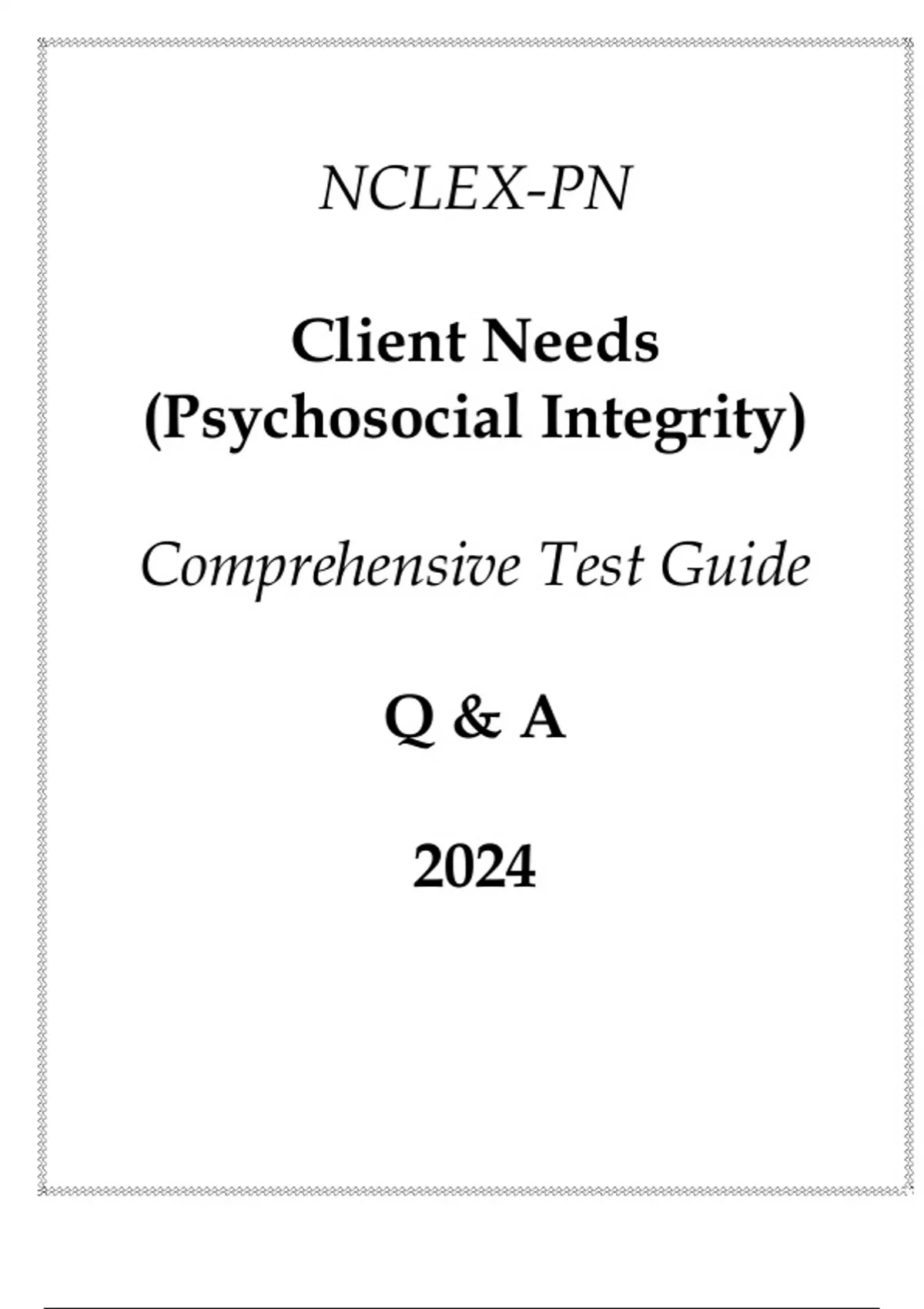 Next Gen NCLEX-PN Client Needs ( Psychosocial Integrity) Comprehensive Test Guide Q & A 2024.Next Gen NCLEX-PN Client Needs ( Psychosocial Integrity) Comprehensive Test GuidNext Gen NCLEX-PN Client Needs ( Psychosocial Integrity) Comprehensive Test Guide Q & A 2024. Q & A 2024.