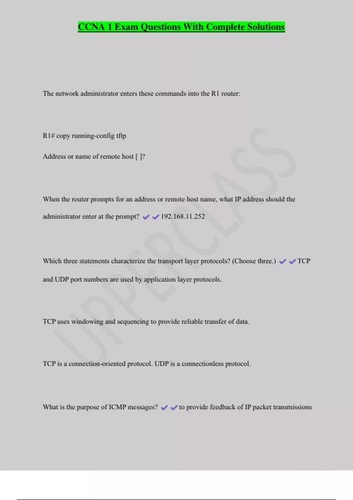 CCNA 1 Exam Questions With Complete Solutions The network administrator enters these commands into the R1 router: R1# copy running-config tftp Address or name of remote host [ ]? When the router prompts for an address or remote host name, what IP address should the administrator enter at the prompt? 192.168.11.252 Which three statements characterize the transport layer protocols? (Choose three.) TCP and UDP port numbers are used by application layer protocols.