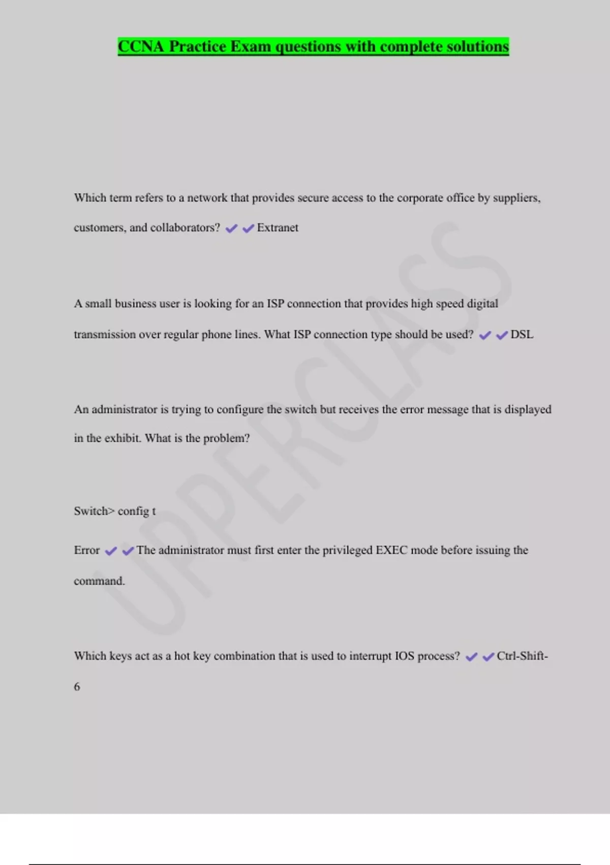 CCNA Practice Exam questions with complete solutions Which term refers to a network that provides secure access to the corporate office by suppliers, customers, and collaborators? Extranet A small business user is looking for an ISP connection that provides high speed digital transmission over regular phone lines. What ISP connection type should be used? DSL An administrator is trying to configure the switch but receives the error message that is displayed in the exhibit. What is the problem?