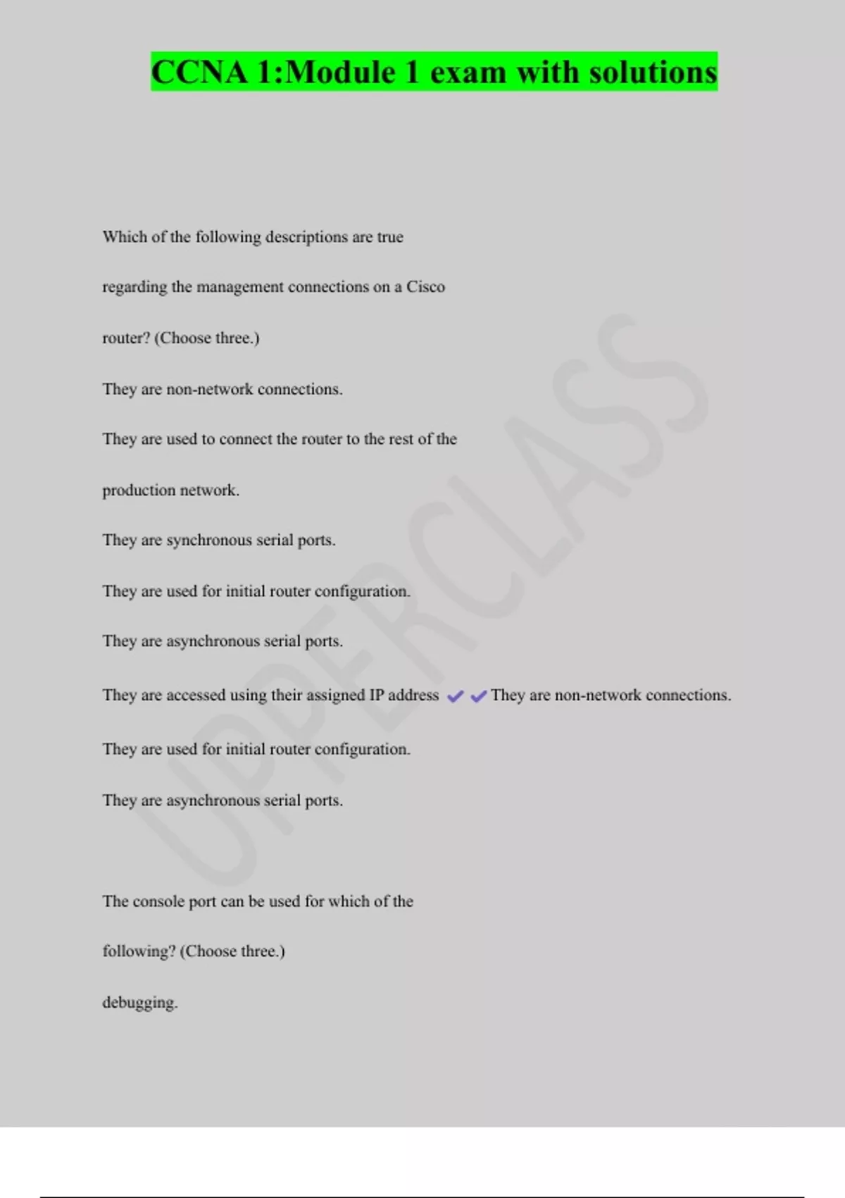 CCNA 1:Module 1 exam with solutions Which of the following descriptions are true regarding the management connections on a Cisco router? (Choose three.) They are non-network connections. They are used to connect the router to the rest of the production network. They are synchronous serial ports. They are used for initial router configuration. They are asynchronous serial ports. They are accessed using their assigned IP address They are non-network connections. They are used for initial router configuration. They are asynchronous serial ports.