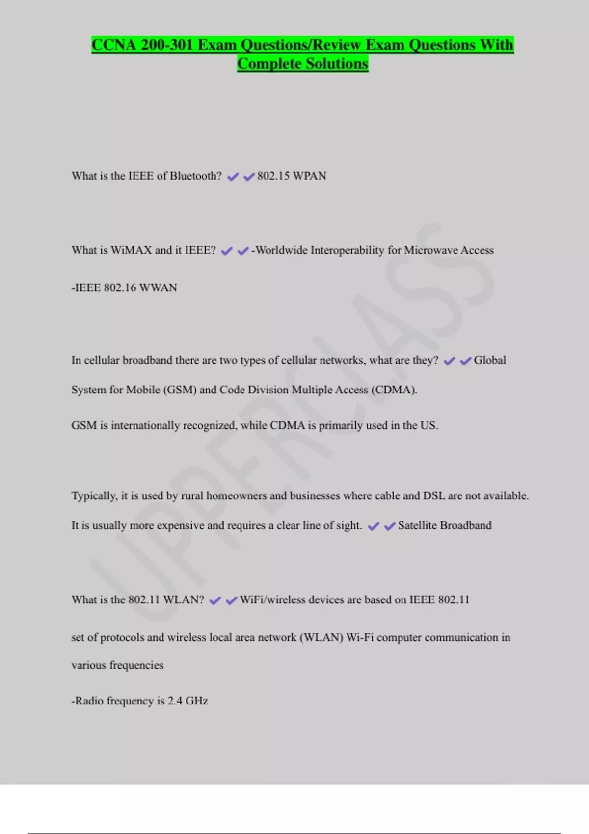 CCNA 200-301 Exam Questions/Review Exam Questions With Complete Solutions What is the IEEE of Bluetooth? 802.15 WPAN What is WiMAX and it IEEE? -Worldwide Interoperability for Microwave Access -IEEE 802.16 WWAN In cellular broadband there are two types of cellular networks, what are they? Global System for Mobile (GSM) and Code Division Multiple Access (CDMA). GSM is internationally recognized, while CDMA is primarily used in the US. Typically, it is used by rural homeowners and businesses where cable and DSL are not available. It is usually more expensive and requires a clear line of sight. Satellite Broadband
