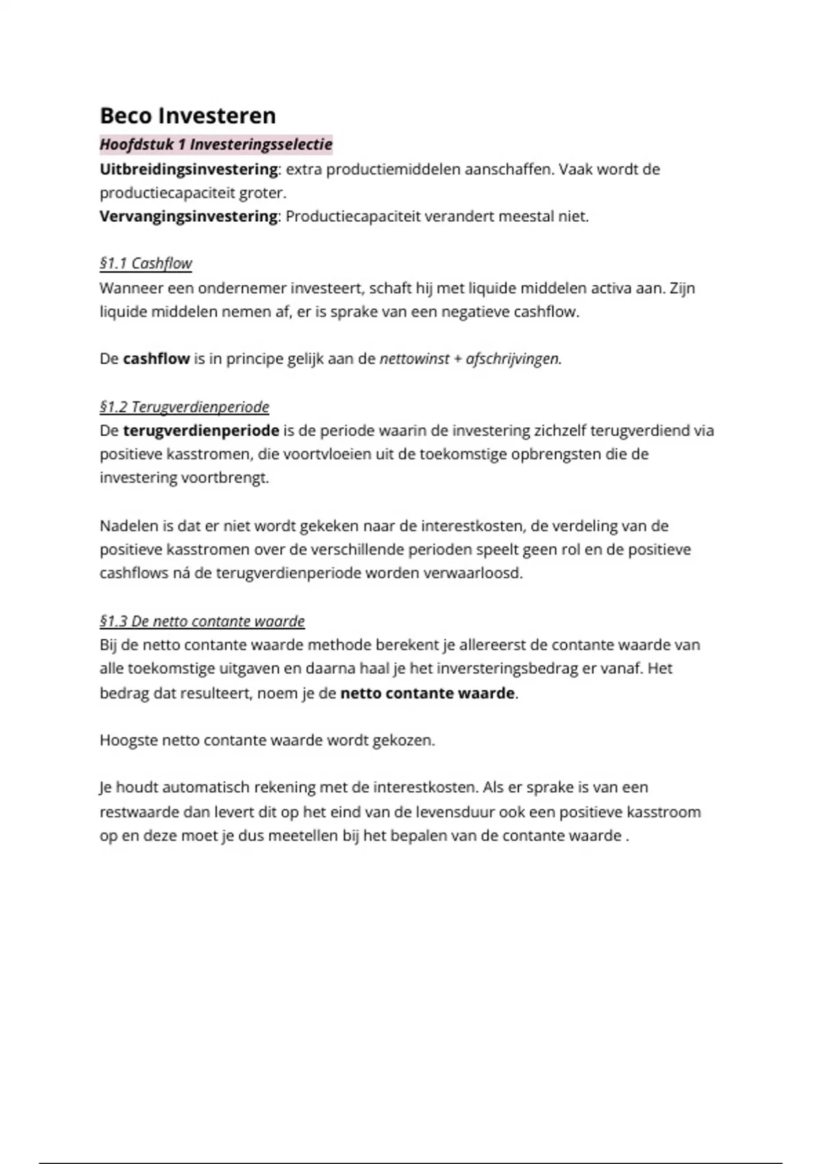 In het document vind je een complete samenvatting van de lesbrief Investeren vwo 6 (Bedrijfseconomie). Per hoofdstuk staat alles wat je moet weten overzichtelijk voor je opgeschreven.