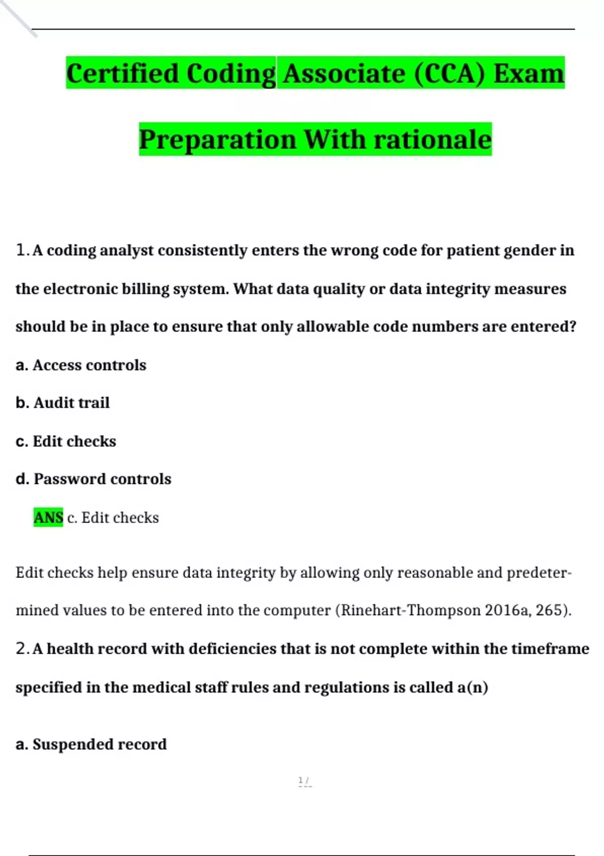 Certified Coding Associate (CCA) Exam Preparation - with rationale Questions and Answers Latest (2024 / 2025) (Verified Answers).