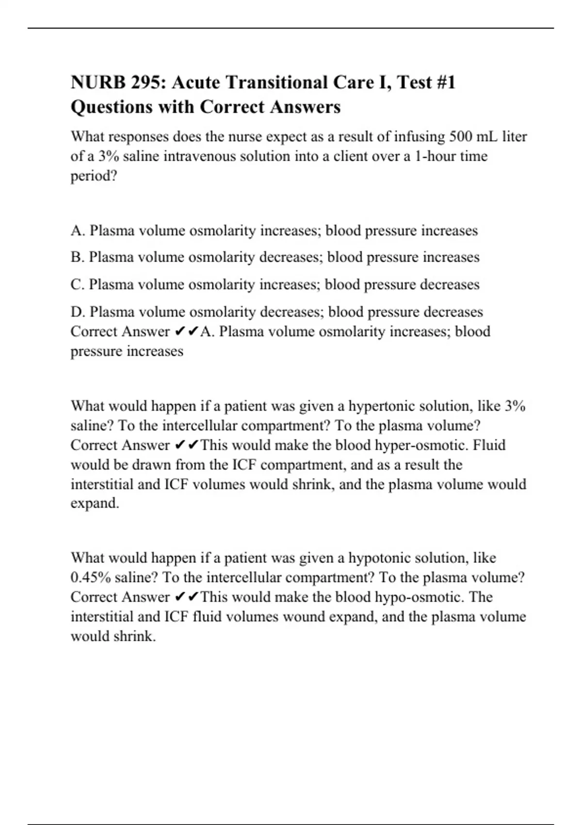 NURB 295: Acute Transitional Care I, Test #1 Questions with Correct Answers
