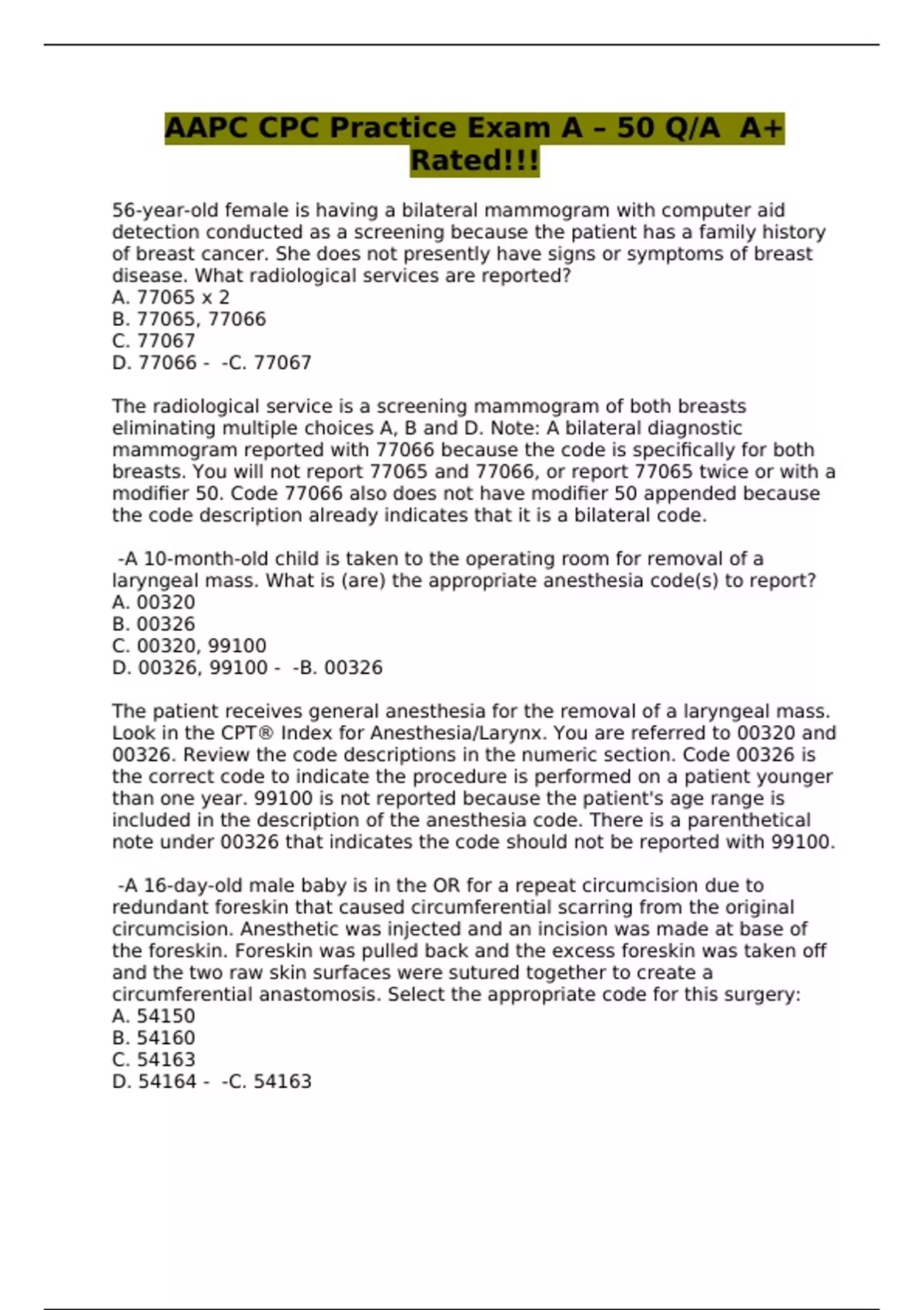 AAPC CPC Practice Exam A – 50 Q/A A+ Rated!!!