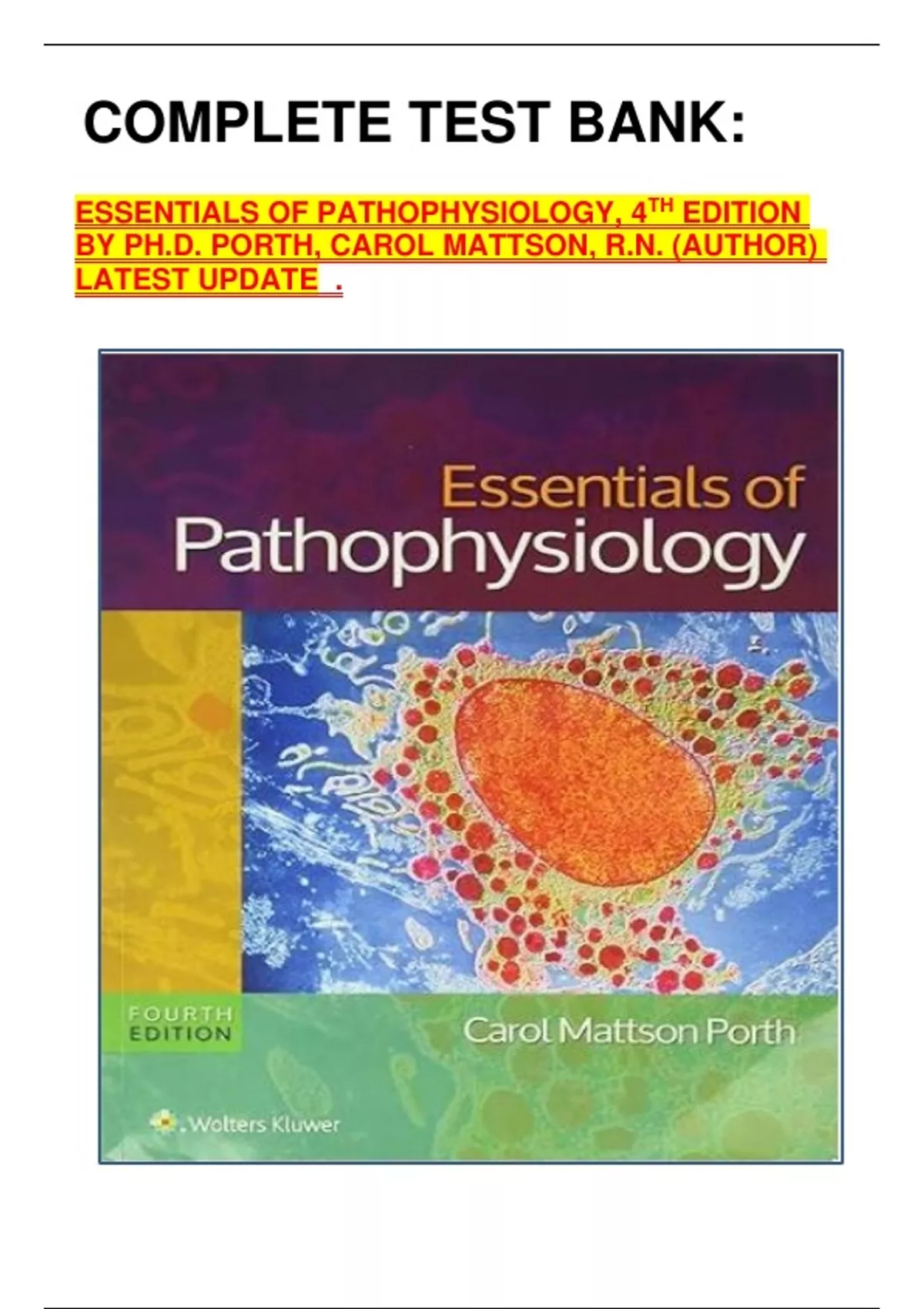 COMPLETE TEST BANK: ESSENTIALS OF PATHOPHYSIOLOGYCOMPLETE TEST BANK: ESSENTIALS OF PATHOPHYSIOLOGY, 4TH EDITION BY PH.D. PORTH, CAROL MATTSON, R.N. (AUTHOR) LATEST UPDATE .