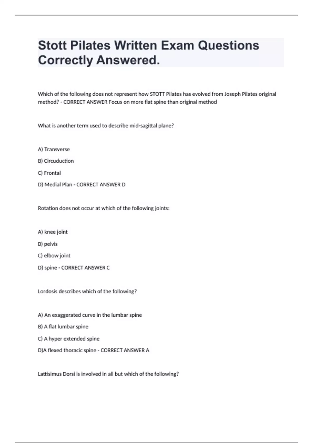 Stott Pilates Written Exam Questions Correctly Answered. Which of the following does not represent how STOTT Pilates has evolved from Joseph Pilates original method? - CORRECT ANSWER Focus on more flat spine than original method What is another term used to describe mid-sagittal plane? A) Transverse B) Circuduction C) Frontal D) Medial Plan - CORRECT ANSWER D Rotation does not occur at which of the following joints: A) knee joint B) pelvis C) elbow joint D) spine - CORRECT ANSWER C Lordosis describes which of the following? A) An exaggerated curve in the lumbar spine B) A flat lumbar spine C) A hyper extended spine D)A flexed thoracic spine - CORRECT ANSWER A Lattisimus Dorsi is involved in all but which of the following? A) Extension B) Retraction C) Medially Rotates D) Flexion - CORRECT ANSWER D Lattismus Dorsi assists in forced expiration? A) True B) False - CORRECT ANSWER A Which muscle flexes the knee and extends the hip? A) Rectus Femoris B) Semimembranousous C) Semitendinous D Bicepts Femoris - CORRECT ANSWER D