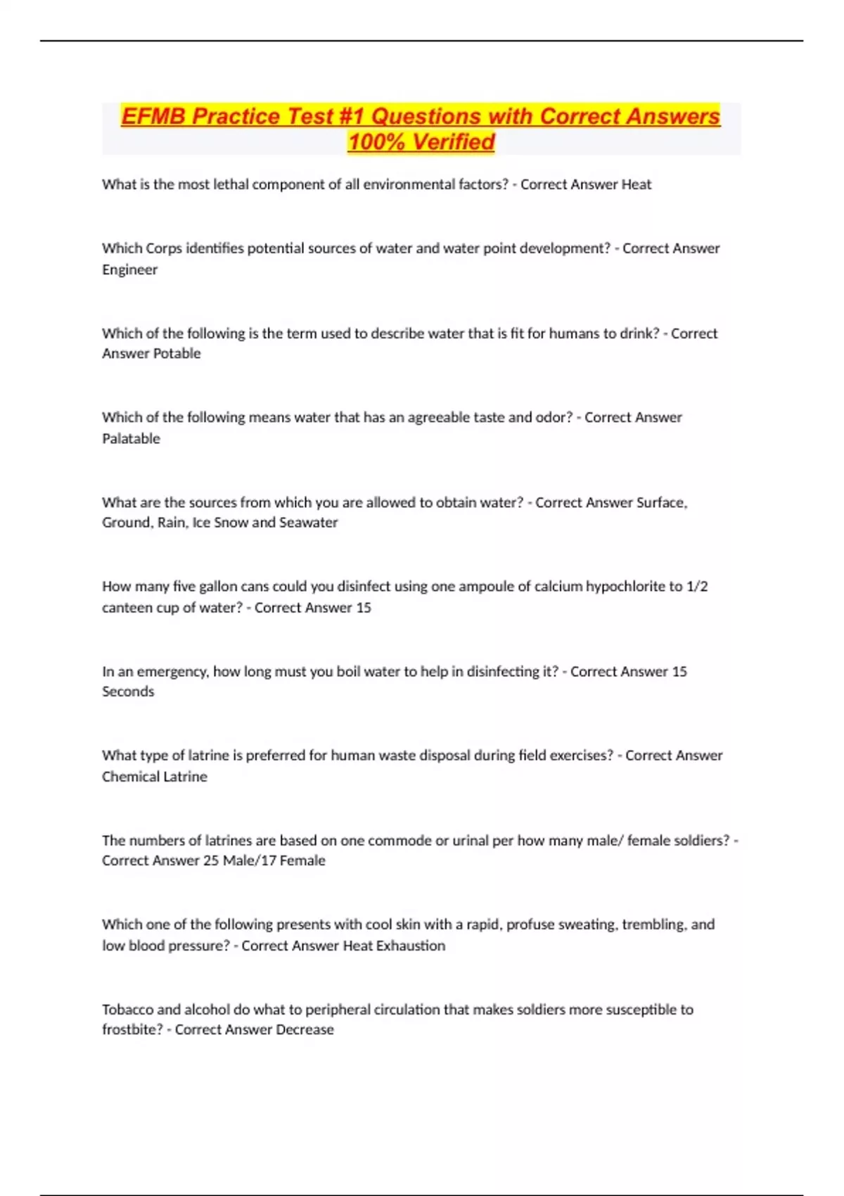 EFMB Practice Test #1 Questions with Correct Answers 100% Verified What is the most lethal component of all environmental factors? - Correct Answer Heat Which Corps identifies potential sources of water and water point development? - Correct Answer Engineer Which of the following is the term used to describe water that is fit for humans to drink? - Correct Answer Potable Which of the following means water that has an agreeable taste and odor? - Correct Answer Palatable What are the sources from which you are allowed to obtain water? - Correct Answer Surface, Ground, Rain, Ice Snow and Seawater How many five gallon cans could you disinfect using one ampoule of calcium hypochlorite to 1/2 canteen cup of water? - Correct Answer 15 In an emergency, how long must you boil water to help in disinfecting it? - Correct Answer 15 Seconds What type of latrine is preferred for human waste disposal during field exercises? - Correct Answer Chemical Latrine The numbers of latrines are based on one commode or urinal per how many male/ female soldiers? - Correct Answer 25 Male/17 Female Which one of the following presents with cool skin with a rapid, profuse sweating, trembling, and low blood pressure? - Correct Answer Heat Exhaustion Tobacco and alcohol do what to peripheral circulation that makes soldiers more susceptible to frostbite? - Correct Answer Decrease Early signs of heat stroke include headach
