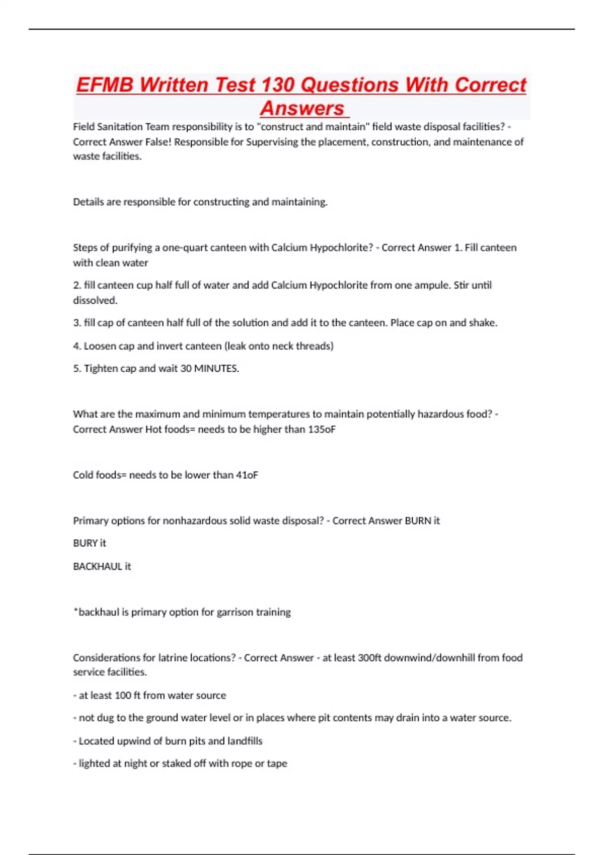 EFMB Written Test 130 Questions With Correct Answers Field Sanitation Team responsibility is to "construct and maintain" field waste disposal facilities? - Correct Answer False! Responsible for Supervising the placement, construction, and maintenance of waste facilities. Details are responsible for constructing and maintaining. Steps of purifying a one-quart canteen with Calcium Hypochlorite? - Correct Answer 1. Fill canteen with clean water 2. fill canteen cup half full of water and add Calcium Hypochlorite from one ampule. Stir until dissolved. 3. fill cap of canteen half full of the solution and add it to the canteen. Place cap on and shake. 4. Loosen cap and invert canteen (leak onto neck threads) 5. Tighten cap and wait 30 MINUTES. What are the maximum and minimum temperatures to maintain potentially hazardous food? - Correct Answer Hot foods= needs to be higher than 135oF Cold foods= needs to be lower than 41oF Primary options for nonhazardous solid waste disposal? - Correct Answer BURN it BURY it BACKHAUL it *backhaul is primary option for garrison training Considerations for latrine locations? - Correct Answer - at least 300ft downwind/downhill from food service facilities. - at least 100 ft from water source - not dug to the ground water level or in places where pit contents may drain into a water source. - Located upwind of burn pits and landfills - lighted at night or sta