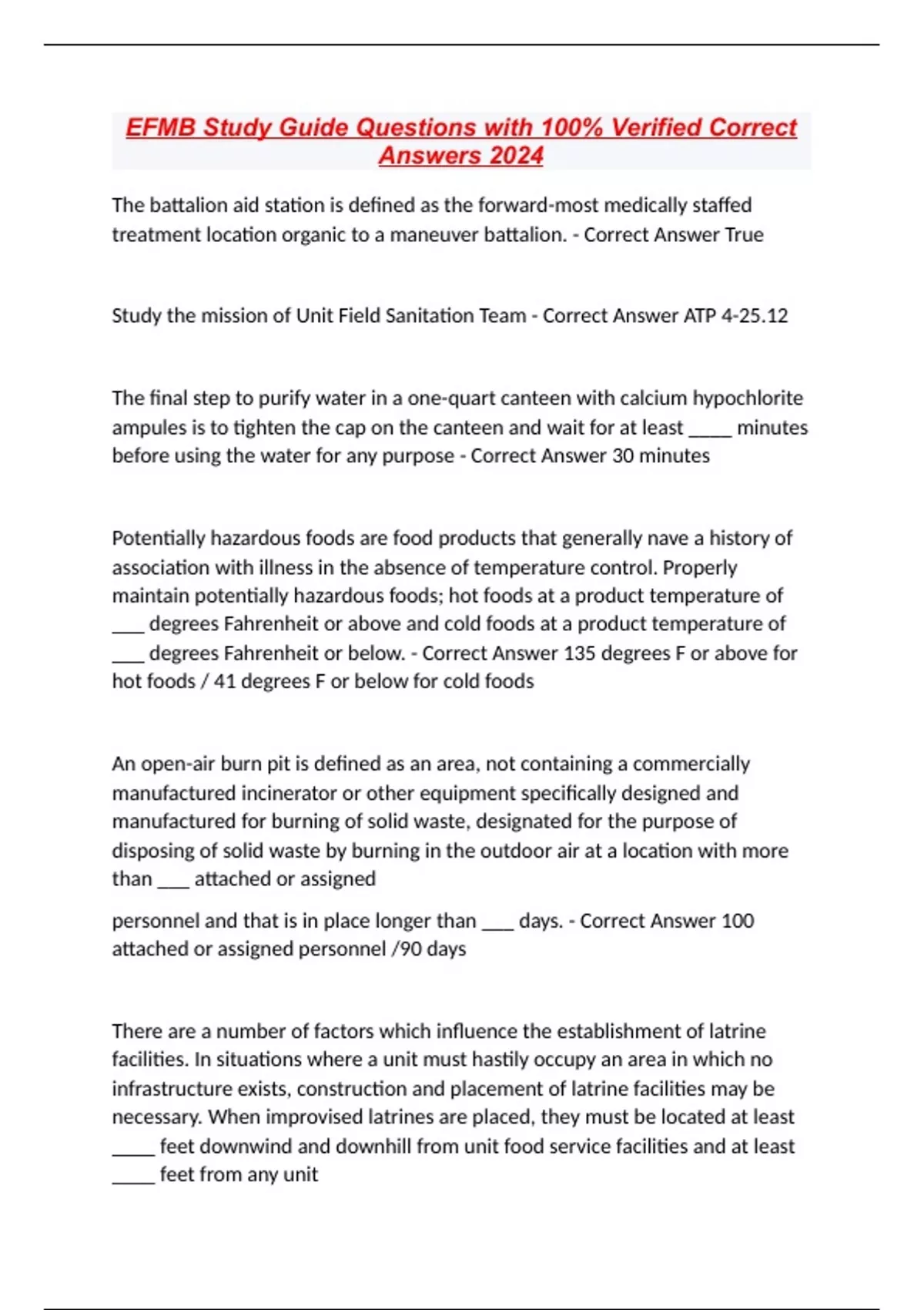 EFMB Study Guide Questions with 100% Verified Correct Answers 2024