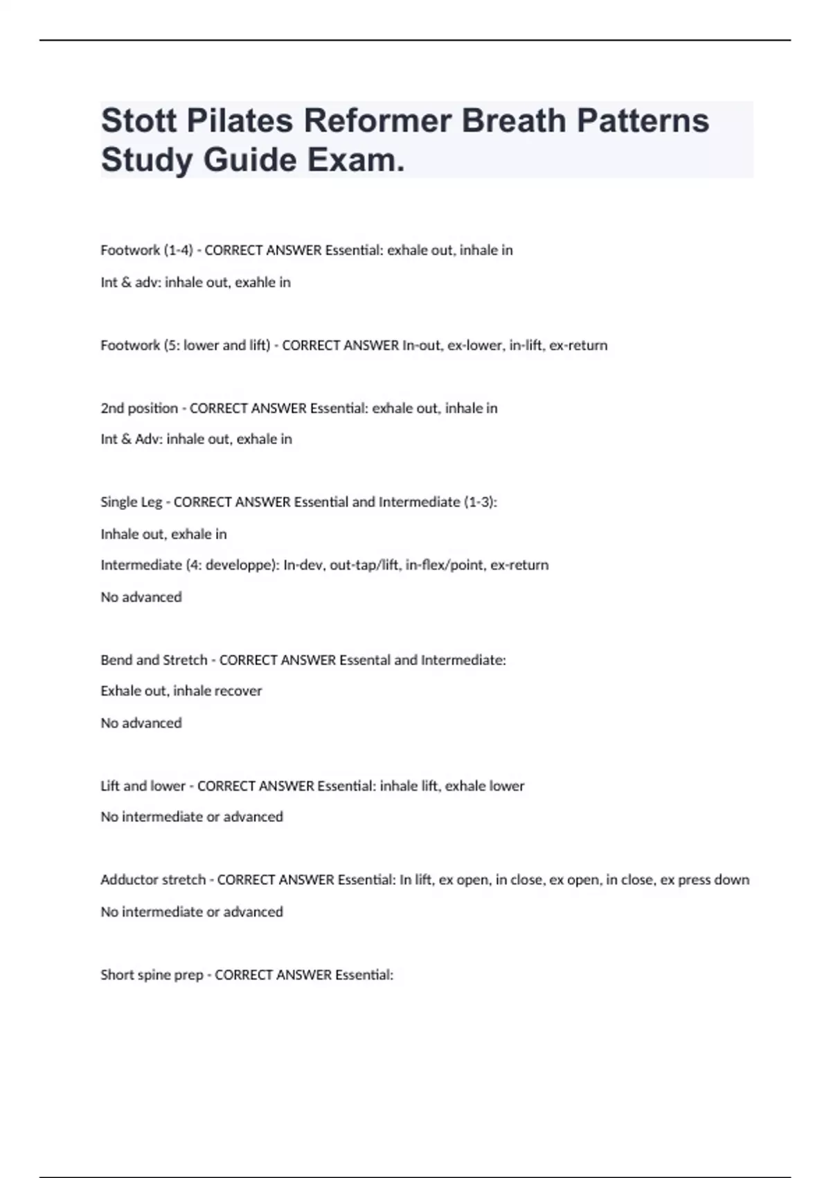 Stott Pilates Reformer Breath Patterns Study Guide Exam. Footwork (1-4) - CORRECT ANSWER Essential: exhale out, inhale in Int & adv: inhale out, exahle in Footwork (5: lower and lift) - CORRECT ANSWER In-out, ex-lower, in-lift, ex-return 2nd position - CORRECT ANSWER Essential: exhale out, inhale in Int & Adv: inhale out, exhale in Single Leg - CORRECT ANSWER Essential and Intermediate (1-3): Inhale out, exhale in Intermediate (4: developpe): In-dev, out-tap/lift, in-flex/point, ex-return No advanced Bend and Stretch - CORRECT ANSWER Essental and Intermediate: Exhale out, inhale recover No advanced Lift and lower - CORRECT ANSWER Essential: inhale lift, exhale lower No intermediate or advanced Adductor stretch - CORRECT ANSWER Essential: In lift, ex open, in close, ex open, in close, ex press down No intermediate or advanced Short spine prep - CORRECT ANSWER Essential: