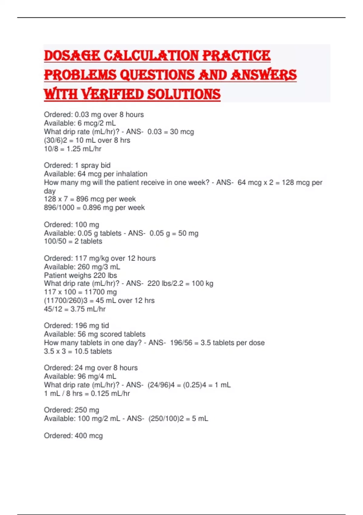 Dosage calculation practice problems Questions and Answers with verified solutions Ordered: 0.03 mg over 8 hours Available: 6 mcg/2 mL What drip rate (mL/hr)? - ANS- 0.03 = 30 mcg (30/6)2 = 10 mL over 8 hrs 10/8 = 1.25 mL/hr Ordered: 1 spray bid Available: 64 mcg per inhalation How many mg will the patient receive in one week? - ANS- 64 mcg x 2 = 128 mcg per day 128 x 7 = 896 mcg per week 896/1000 = 0.896 mg per week Ordered: 100 mg Available: 0.05 g tablets - ANS- 0.05 g = 50 mg 100/50 = 2 tablets Ordered: 117 mg/kg over 12 hours Available: 260 mg/3 mL Patient weighs 220 lbs What drip rate (mL/hr)? - ANS- 220 lbs/2.2 = 100 kg 117 x 100 = 11700 mg (11700/260)3 = 45 mL over 12 hrs 45/12 = 3.75 mL/hr Ordered: 196 mg tid Available: 56 mg scored tablets How many tablets in one day? - ANS- 196/56 = 3.5 tablets per dose 3.5 x 3 = 10.5 tablets Ordered: 24 mg over 8 hours Available: 96 mg/4 mL What drip rate (mL/hr)? - ANS- (24/96)4 = (0.25)4 = 1 mL 1 mL / 8 hrs = 0.125 mL/hr Ordered: 250 mg Available: 100 mg/2 mL - ANS- (250/100)2 = 5 mL Ordered: 400 mcg Available: 0.08 mg/0.5 mL - ANS- 0.08 mg = 80 mcg (400/80)0.5 = 2.5 mL Ordered: 6 mL over 12 hours Available: 120 mg/4 mL How many mg will the patient receive after 6 hours? - ANS- (6 mL/4 mL)120 mg = 180 mg over 12 hrs Since 6 hrs is half of 12 hrs, the patient will receive half of the total mg. Thus, 180/2 = 90 mg Ordered: 8 mcg/kg/hr Available: 0.64 mg/2 mL Patient weighs 80 kg What drip rate (mL/hr)? - ANS- 8x80 = 640 mcg 0.64 = 640 mcg (640/640)2 = 2 mL