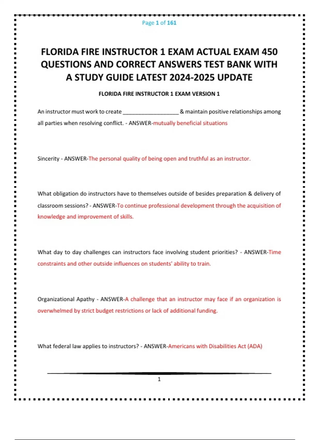 FLORIDA FIRE INSTRUCTOR 1 EXAM ACTUAL EXAM 450 QUESTIONS AND CORRECT ANSWERS TEST BANK WITH A STUDY GUIDE LATEST UPDATE