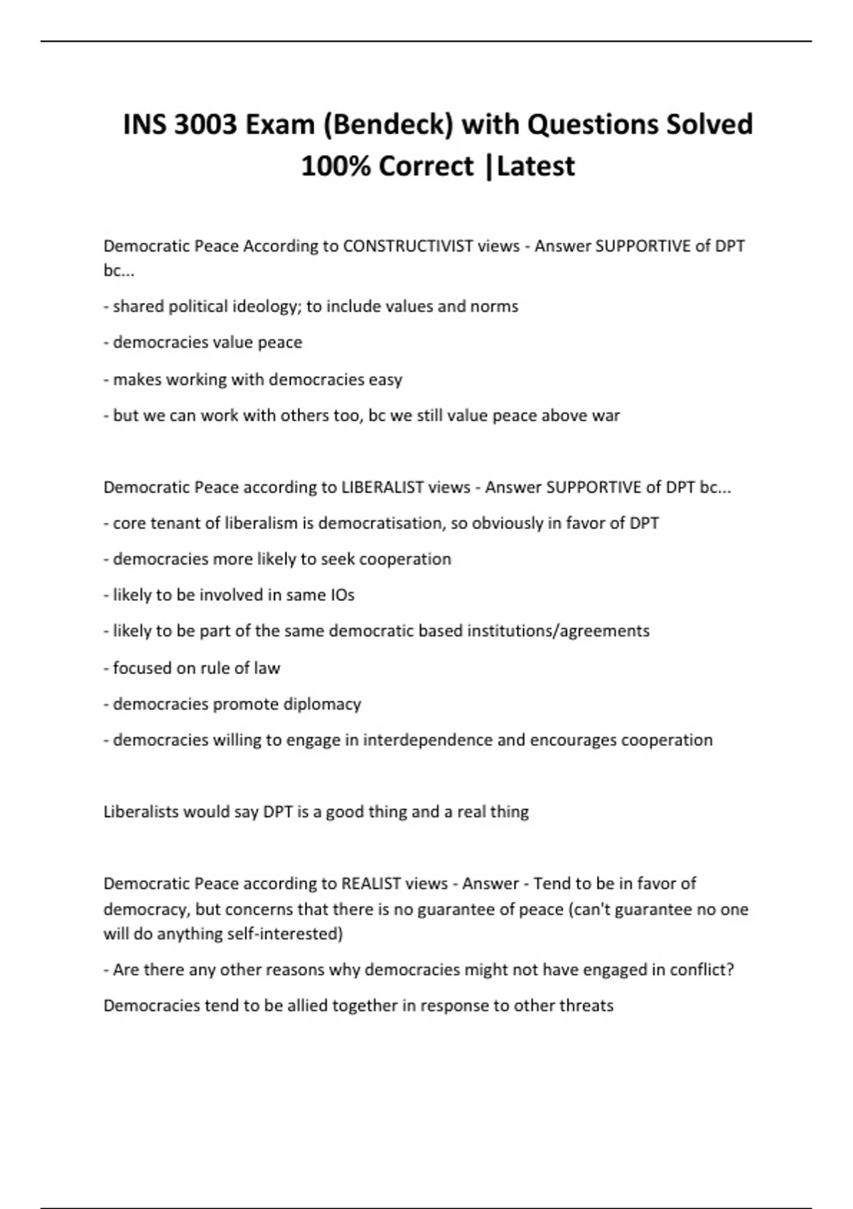 Democratic Peace According to CONSTRUCTIVIST views - Answer SUPPORTIVE of DPT bc... - shared political ideology; to include values and norms - democracies value peace - makes working with democracies easy - but we can work with others too, bc we still value peace above war
