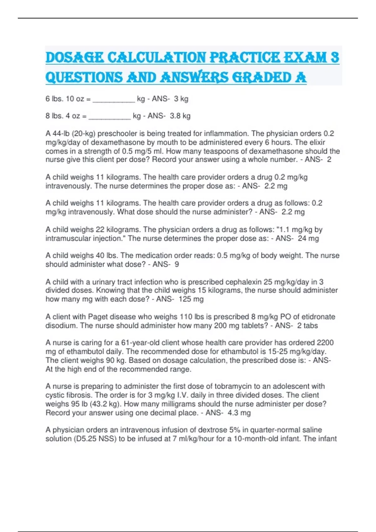 Dosage Calculation Practice Exam 3 Questions and Answers Graded A 6 lbs. 10 oz = __________ kg - ANS- 3 kg 8 lbs. 4 oz = __________ kg - ANS- 3.8 kg A 44-lb (20-kg) preschooler is being treated for inflammation. The physician orders 0.2 mg/kg/day of dexamethasone by mouth to be administered every 6 hours. The elixir comes in a strength of 0.5 mg/5 ml. How many teaspoons of dexamethasone should the nurse give this client per dose? Record your answer using a whole number. - ANS- 2 A child weighs 11 kilograms. The health care provider orders a drug 0.2 mg/kg intravenously. The nurse determines the proper dose as: - ANS- 2.2 mg A child weighs 11 kilograms. The health care provider orders a drug as follows: 0.2 mg/kg intravenously. What dose should the nurse administer? - ANS- 2.2 mg A child weighs 22 kilograms. The physician orders a drug as follows: "1.1 mg/kg by intramuscular injection." The nurse determines the proper dose as: - ANS- 24 mg A child weighs 40 lbs. The medication order reads: 0.5 mg/kg of body weight. The nurse should administer what dose? - ANS- 9 A child with a urinary tract infection who is prescribed cephalexin 25 mg/kg/day in 3 divided doses. Knowing that the child weighs 15 kilograms, the nurse should administer how many mg with each dose? - ANS- 125 mg A client with Paget disease who weighs 110 lbs is prescribed 8 mg/kg PO of etidronate disodium. The nurse should administer how many 200 mg tablets? - ANS- 2 tabs A nurse is caring for a 61-year-old client whose health care provider has ordered 2200 mg of ethambutol daily. The recommended dose for ethambutol is 15-25 mg/kg/day. The client weighs 90 kg. Based on dosage calculation, the prescribed dose is: - ANS- At the high end of the recommended range. A nurse is preparing to administer the first dose of tobramycin to an adolescent with cystic fibrosis. The order is for 3 mg/kg I.V. daily in three divided doses. The client weighs 95 lb (43.2 kg). How many milligrams should the nurse administer per dose? Record your answer using one decimal place. - ANS- 4.3 mg A physician orders an intravenous infusion of dextrose 5% in quarter-normal saline solution (D5.25 NSS) to be infused at 7 ml/kg/hour for a 10-month-old infant. The infant weighs 22 lb (10 kg). How many milliliters of the ordered solution would the nurse infuse each hour? Record your answer using a whole number. - ANS- 70 mL An antineoplastic medication is prescribed for a child. The nurse is verifying the dose is the recommended dose for a child with a certain body surface area (BSA). The child's BSA is 0.43 m2. The average adult BSA is 1.7 m2, and the usual adult dose of this medication is 40 mg. What is the recommended child's dose? (Round to the nearest whole number.) - ANS- 10 In preparation for the delivery of anesthesia for surgery, an adult client's weight is measured and documented as 75.7 kg. This measurement is equivalent to how many pounds? - ANS- 166.5 lb Medication doses given to children are usually smaller than those given to adults. Doses for children can also be calculated based on the child's weight. Which would be correct when calculating a dose based on weight? - ANS- 1 kg equals 2.2 lbs Remicade 3 mg/kg IV infusion monthly has been prescribed for a client diagnosed with rheumatoid arthritis. The client weighs 150 pounds. How many mg of Remicade will be infused? Round your answer to the nearest whole number. - ANS- 205 The nurse is determining the recommended dose of medication for a child. The nursing drug handbook reads "Recommended dose is 15 mg per kg." The child's weight is 25 kg. The recommended dose for this child is: - ANS- 375 mg The physician orders cefazolin 2.1 g every 8 hours for a child with a serious joint infection. The child weighs 95 lbs. The drug reference indicates that the usual IM or IV dosae for infants and children is 50 to 100 mg/kg/day divided every 8 hours; maximum dosage is 6 g/day. Is the dosage ordered safe? - ANS- Unsafe The physician orders Kantrex 34 mg IM 3x/day for a 7 lb 8oz infanct. The recommended maximum dosage for infants is 15 mg/kg/day in two equally divided doses. Available is Kantrex 75 mg per 2 mL. Is the ordered dosage safe? - ANS- Unsafe The physician orders Pathocil 125 mg PO every 6 hours for a 55 lb. child. The recommended dosage of Pathocil for children weighing less than 40 kg is 12.5 to 50 mg/kg/day PO in equally divided doses every 6 hours for moderate to severe infections. Is this dosage safe? - ANS- Safe