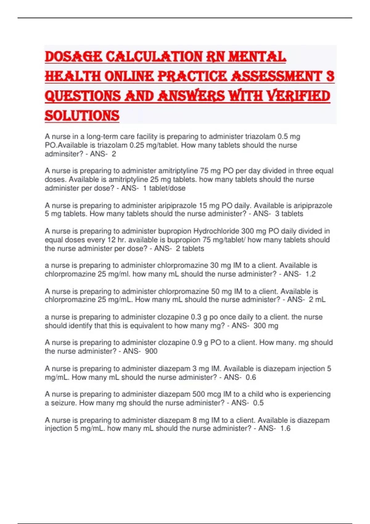 Dosage calculation RN Mental Health online practice assessment 3 Questions and Answers with verified solutions