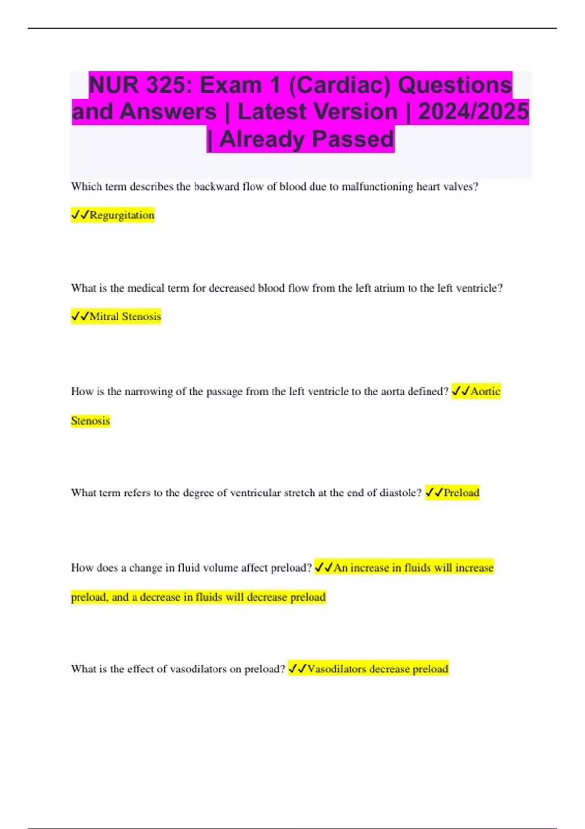 NUR 325: Exam 1 (Cardiac) Questions and Answers | Latest Version | 2024/2025 | Already Passed Which term describes the backward flow of blood due to malfunctioning heart valves? Regurgitation What is the medical term for decreased blood flow from the left atrium to the left ventricle? Mitral Stenosis How is the narrowing of the passage from the left ventricle to the aorta defined? Aortic Stenosis What term refers to the degree of ventricular stretch at the end of diastole? Preload How does a change in fluid volume affect preload? An increase in fluids will increase preload, and a decrease in fluids will decrease preload What is the effect of vasodilators on preload? Vasodilators decrease preload What term describes the resistance the heart must overcome to eject blood from the ventricles? Afterload What impact do hypertension and vasoconstriction have on afterload? Hypertension and vasoconstriction increase afterload, which raises cardiac workload How is the strength of myocardial contraction during systole described? Contractility How are preload and contractility interrelated? Optimal filling of the ventricles allows for maximum stretching and enhances contractility What medications might a nurse administer to increase a patient's contractility? Epinephrine, Digoxin, and Dopamine Which medications can be given to reduce a patient's contractility? Beta-blockers, often referred to as "lol" medications What symptoms might indicate poor perfusion in a patient? Dyspnea, hypotension, and angina, among others observable on an EKG Which dysrhythmias are considered life-threatening? Ventricular Tachycardia (V Tach), Ventricular Fibrillation (V Fib), and Asystole. Torsades de Pointes is also critical, as it's essentially a form of V Tach What should a nurse do first upon noticing a life-threatening rhythm on a patient's EKG? Assess the patient immediately. Check if a lead has fallen off, observe signs of decreased cardiac output, and determine responsiveness and pulse The patient is in V Tach but has a pulse, how can we treat this? We give amiodarone or lidocaine, and use cardioversion (because they have a pulse) The patient is in V Tach but does NOT have a pulse, how do we treat this? CPR and Defibrillation