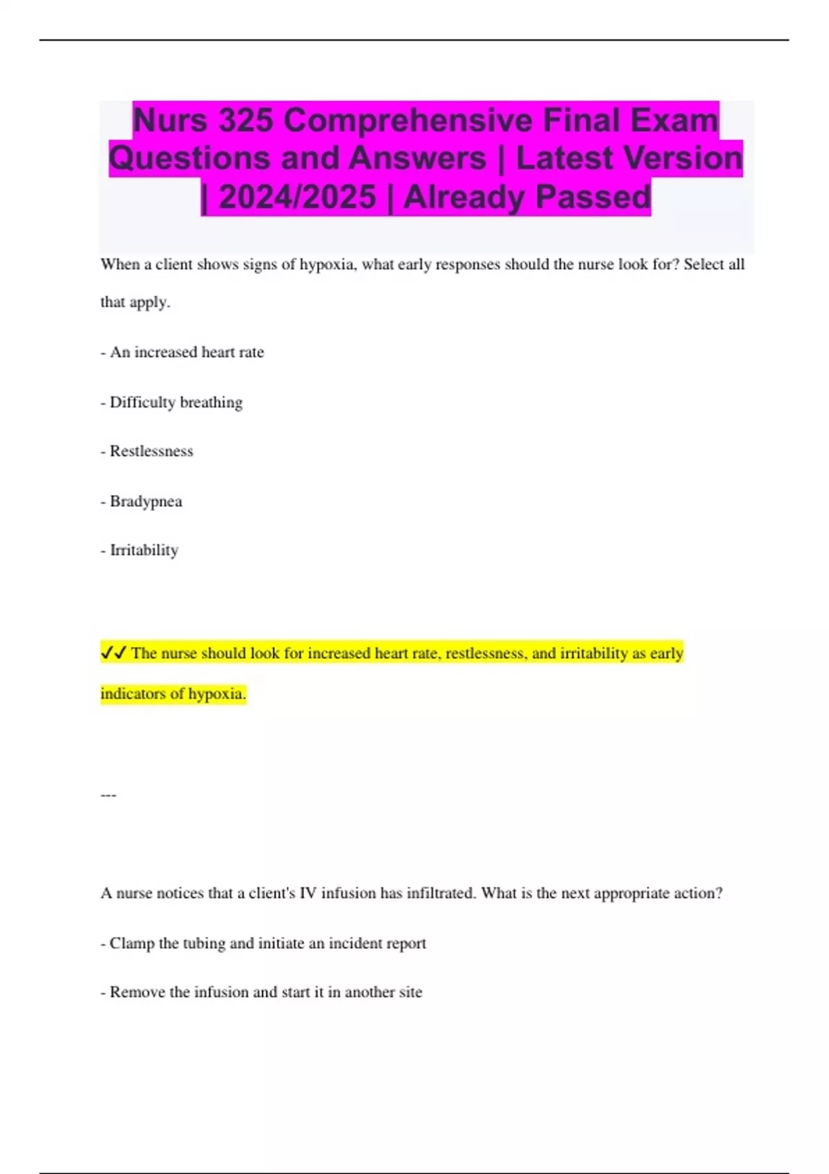 Nurs 325 Comprehensive Final Exam Questions and Answers | Latest Version | 2024/2025 | Already Passed When a client shows signs of hypoxia, what early responses should the nurse look for? Select all that apply. - An increased heart rate - Difficulty breathing - Restlessness - Bradypnea - Irritability The nurse should look for increased heart rate, restlessness, and irritability as early indicators of hypoxia. --- A nurse notices that a client's IV infusion has infiltrated. What is the next appropriate action? - Clamp the tubing and initiate an incident report - Remove the infusion and start it in another site - Slow the infusion to a rate just to keep the vein open - Notify the primary healthcare provider The nurse should remove the infusion and start it in another site to address the infiltration promptly. --- After surgery, a nurse is assessing clients and needs to identify any potential life-threatening events. Which sudden client response should be of concern? - A slightly elevated temperature - Separation of wound edges - Edema of the legs - Chest pain Chest pain is a potentially life-threatening event and requires immediate attention from the nurse. --- A client mentions having a bowel movement every morning. Which additional information should raise concern for perceived constipation? - Hard, dry stools defecated daily - Excessive use of laxatives - Abdominal distention - Straining at stool Excessive use of laxatives indicates a concern for perceived constipation and should be addressed. --- Before administering a sedative to a client pre-surgery, what should the nurse do first? - Verify that the perioperative checklist is completed - Check that the surgical consent is signed - Ensure that the intravenous line is in place - Assess vital signs The nurse should first check that the surgical consent is signed to ensure that all legal requirements are met. --- The primary healthcare provider prescribes 500 mg of an antibiotic to be administered IV piggyback (IVPB) every 6 hours. The vial contains 1 g of the antibiotic in powder form, with instructions to "instill 9.6 mL to yield