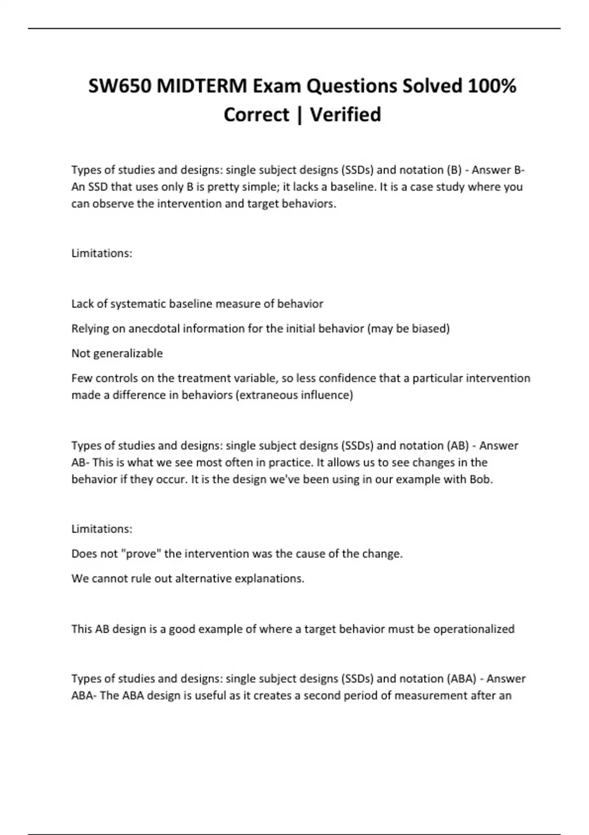 Types of studies and designs: single subject designs (SSDs) and notation (B) - Answer B- An SSD that uses only B is pretty simple; it lacks a baseline. It is a case study where you can observe the intervention and target behaviors. Limitations: Lack of systematic baseline measure of behavior Relying on anecdotal information for the initial behavior (may be biased)