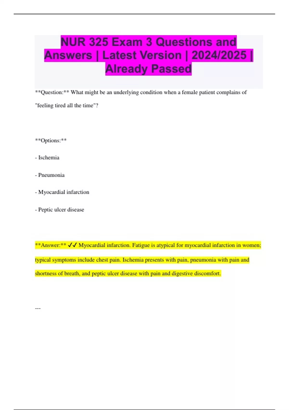NUR 325 Exam 3 Questions and Answers | Latest Version | 2024/2025 | Already Passed **Question:** What might be an underlying condition when a female patient complains of "feeling tired all the time"? **Options:** - Ischemia - Pneumonia - Myocardial infarction - Peptic ulcer disease **Answer:** Myocardial infarction. Fatigue is atypical for myocardial infarction in women; typical symptoms include chest pain. Ischemia presents with pain, pneumonia with pain and shortness of breath, and peptic ulcer disease with pain and digestive discomfort. --- **Question:** A patient asks the nurse about circulation and perfusion. How should the nurse respond? **Options:** - Perfusion prevents clots and increases stamina. - Perfusion delivers oxygen to cells and removes waste products. - Perfusion increases cardiac output. - Perfusion enhances mental alertness. **Answer:** Perfusion delivers oxygen to cells and removes waste products. It doesn't prevent clots, increase cardiac output, or enhance mental alertness. --- **Question:** A 72-year-old man arrives at the emergency room, appearing diaphoretic and anxious with peripheral edema. His vital signs are BP 100/40, HR 130 irregular, RR 26. What do these findings suggest? **Options:** - He is having a myocardial infarction. - He has impaired central perfusion. - He has a viral infection. - He should receive pain medication. **Answer:** These findings suggest impaired central perfusion. Symptoms indicate inadequate blood flow from the heart to the body's tissues and organs. Administering oxygen is crucial. Myocardial infarction typically involves chest pain, elevated blood pressure, and specific electrocardiogram changes. Viral infections usually involve body aches or gastrointestinal symptoms, not rapid heart rates. Pain medication isn't indicated without pain present. --- **Question:** What should the nurse include in teaching about modifiable risk factors for impaired perfusion? **Options:** - Impaired perfusion increases with age. - Genetics play a role in impaired