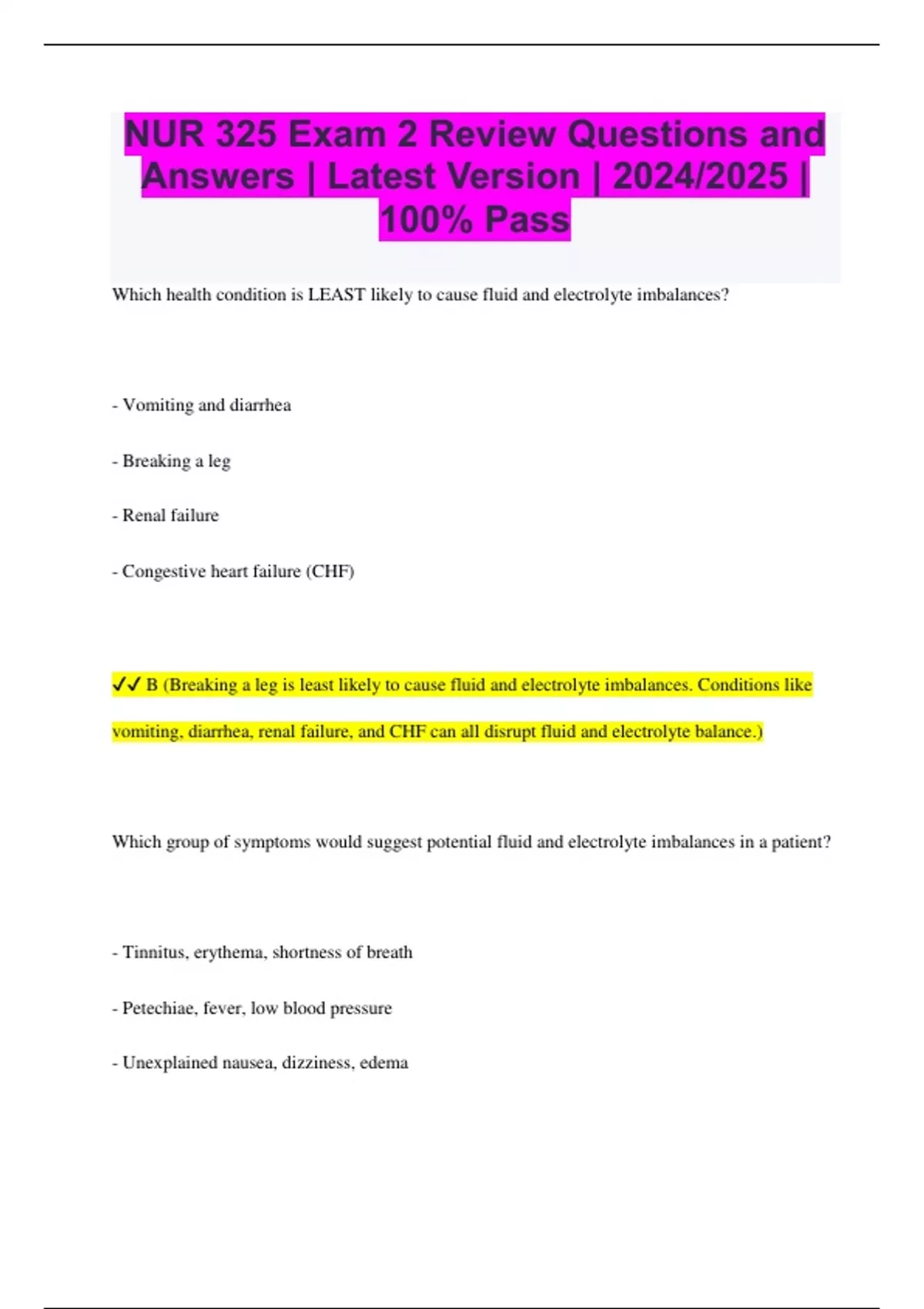 NUR 325 Exam 2 Review Questions and Answers | Latest Version | 2024/2025 | 100% Pass Which health condition is LEAST likely to cause fluid and electrolyte imbalances? - Vomiting and diarrhea - Breaking a leg - Renal failure - Congestive heart failure (CHF) B (Breaking a leg is least likely to cause fluid and electrolyte imbalances. Conditions like vomiting, diarrhea, renal failure, and CHF can all disrupt fluid and electrolyte balance.) Which group of symptoms would suggest potential fluid and electrolyte imbalances in a patient? - Tinnitus, erythema, shortness of breath - Petechiae, fever, low blood pressure - Unexplained nausea, dizziness, edema - Tachycardia, drowsiness, nausea C (Unexplained nausea, dizziness, edema are symptoms that may indicate fluid and electrolyte imbalances. The other options suggest different conditions.) A patient asks the nurse for recommendations regarding bladder health. What is a key recommendation the nurse should make? - Eat foods high in fiber. - Drink 6 to 8 glasses of noncaffeinated fluids daily. - Exercise in the morning and evening. - Visit the urologist once yearly. B (Drinking 6 to 8 glasses of noncaffeinated fluids daily supports bladder health by preventing urine stagnation. While the other options promote general health, they are not specifically targeted at bladder health.) The nurse instructs an unlicensed assistant about toileting a confused patient in restraints. How can the nurse confirm the assistant understands the procedure? - The patient must remain in the restraints all day. - The patient needs to be toileted to maintain a regular schedule. - The patient should be provided with adult briefs for incontinence. - The patient will use the call bell when feeling the urge to void. B (Toileting the patient to maintain a regular schedule is essential and ensures basic care needs are met. The other options do not address the patient's toileting needs appropriately.) If a patient has a colostomy in the ascending colon, what stool consistency should the nurse expect in the colostomy device? - Stool would be dark. - Stool would be formed. - Stool would be loose. - Stool would have flecks of blood.