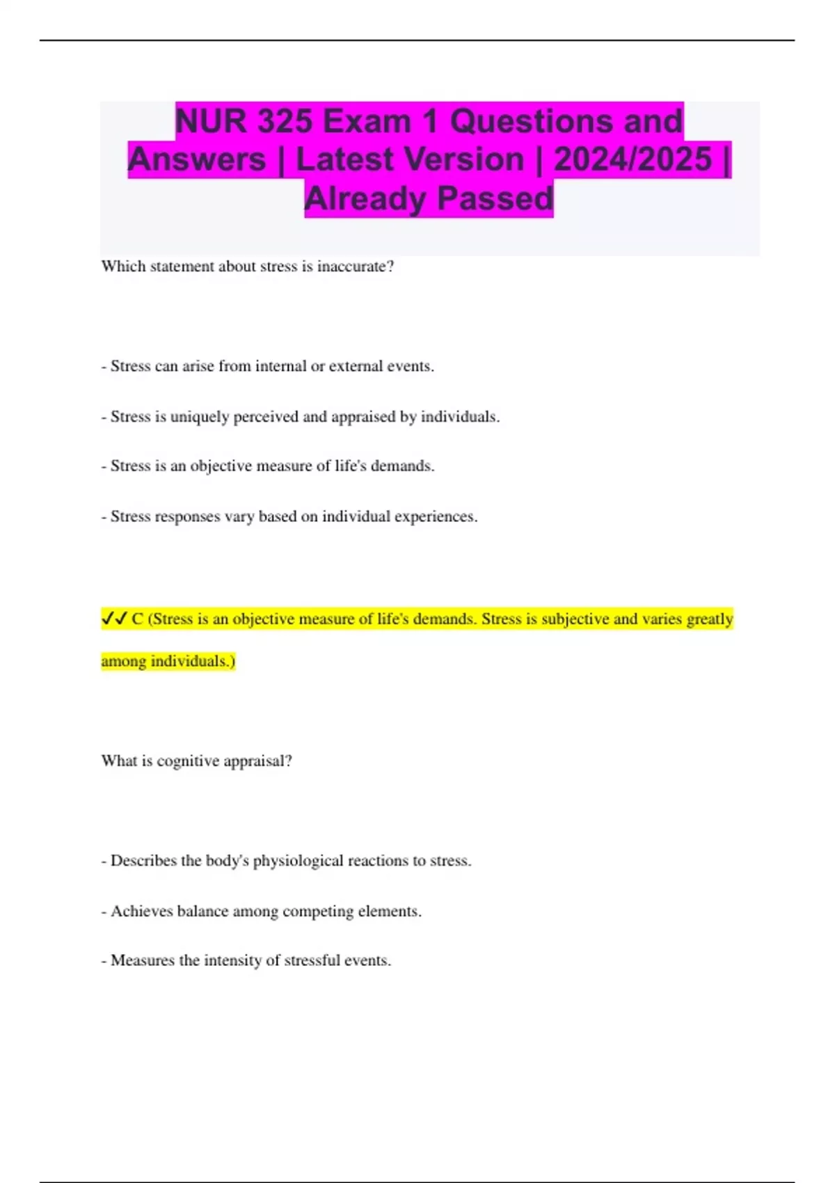 NUR 325 Exam 1 Questions and Answers | Latest Version | 2024/2025 | Already Passed Which statement about stress is inaccurate? - Stress can arise from internal or external events. - Stress is uniquely perceived and appraised by individuals. - Stress is an objective measure of life's demands. - Stress responses vary based on individual experiences. C (Stress is an objective measure of life's demands. Stress is subjective and varies greatly among individuals.) What is cognitive appraisal? - Describes the body's physiological reactions to stress. - Achieves balance among competing elements. - Measures the intensity of stressful events. - Involves cognitive and behavioral efforts to manage stress. C (Measures the intensity of stressful events. Cognitive appraisal refers to an individual's perception of the significance of stressors.) What is general adaptation syndrome (GAS)? - Describes short-term and long-term stress reactions. - Maintains equilibrium among competing factors. - Evaluates personal stress perception. - Involves cognitive and behavioral strategies for stress management. A (Describes short-term and long-term stress reactions. GAS refers to the body's physiological responses to stress over time.) Chronic stress may lead to: - Hypoglycemia - Disruption of homeostasis - Positive psychological outcomes - Enhanced social interactions B (Disruption of homeostasis. Chronic stress can lead to prolonged physiological imbalance.) What is coping? - Manages short-term and long-term stress responses. - Balances competing demands effectively. - Assesses personal stress perception. - Engages in cognitive and behavioral responses to stress. D (Engages in cognitive and behavioral responses to stress. Coping involves adaptive strategies to manage stress.) Which physiological responses are typical during stress? (Select all that apply.) - Decreased water retention
