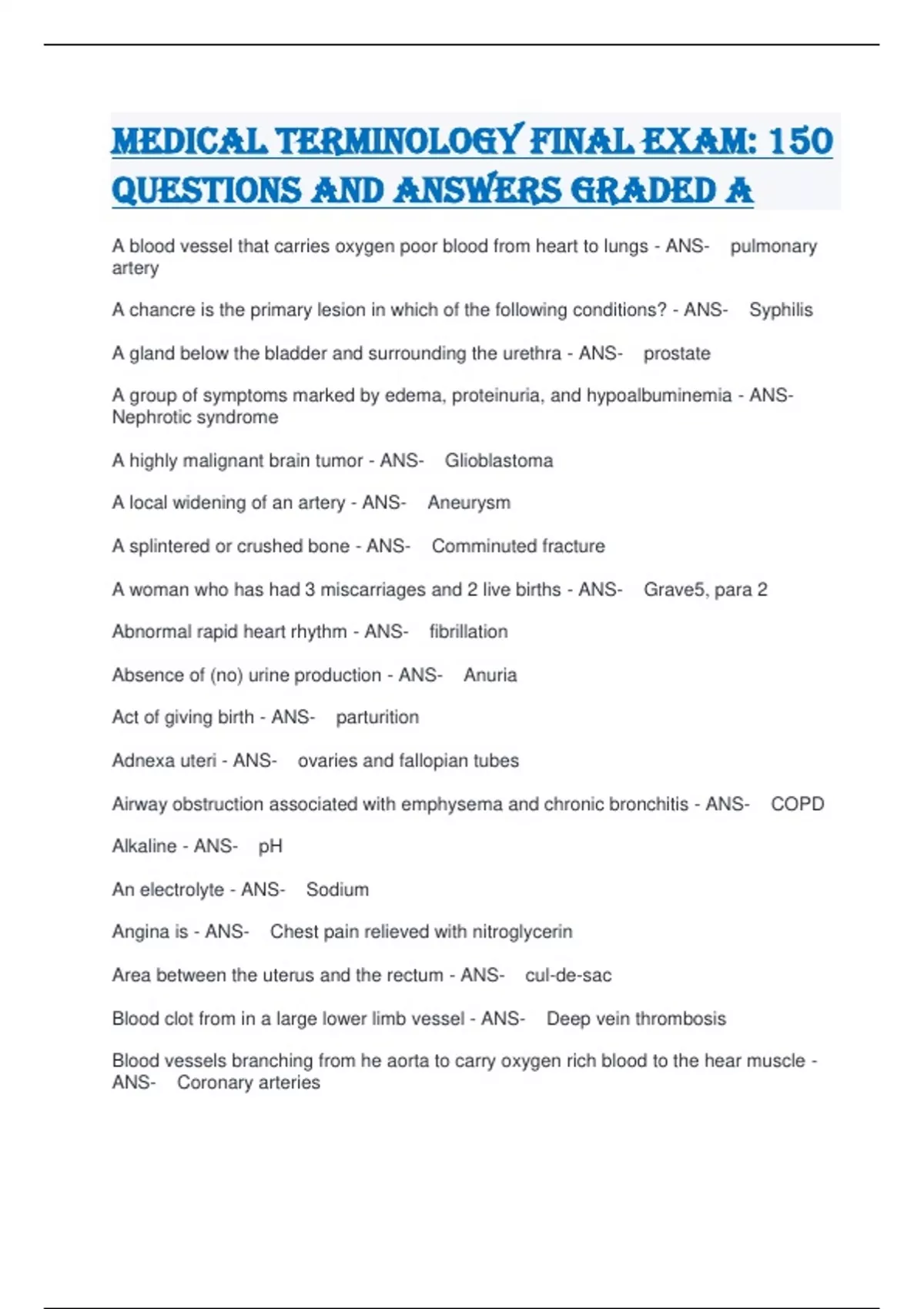Medical Terminology Final Exam: 150 questions and Answers Graded A A blood vessel that carries oxygen poor blood from heart to lungs - ANS- pulmonary artery A chancre is the primary lesion in which of the following conditions? - ANS- Syphilis A gland below the bladder and surrounding the urethra - ANS- prostate A group of symptoms marked by edema, proteinuria, and hypoalbuminemia - ANS- Nephrotic syndrome A highly malignant brain tumor - ANS- Glioblastoma A local widening of an artery - ANS- Aneurysm A splintered or crushed bone - ANS- Comminuted fracture A woman who has had 3 miscarriages and 2 live births - ANS- Grave5, para 2 Abnormal rapid heart rhythm - ANS- fibrillation Absence of (no) urine production - ANS- Anuria Act of giving birth - ANS- parturition Adnexa uteri - ANS- ovaries and fallopian tubes Airway obstruction associated with emphysema and chronic bronchitis - ANS- COPD Alkaline - ANS- pH An electrolyte - ANS- Sodium Angina is - ANS- Chest pain relieved with nitroglycerin Area between the uterus and the rectum - ANS- cul-de-sac Blood clot from in a large lower limb vessel - ANS- Deep vein thrombosis Blood vessels branching from he aorta to carry oxygen rich blood to the hear muscle - ANS- Coronary arteries Breathing is easier in an upright position - ANS- Orthopnea Bronchial airway obstruction marked by paroxysmal dyspnea, wheezing and cough - ANS- Asthma Burning sensation of pain - ANS- Causalgia Cardiac Arrhythmia - ANS- fibrillation Cerebral aneurysm - ANS- Cerebrovascular accident( stroke) Childhood renal carcinoma - ANS- Wilms tumor Chronic inflammation of bones and joints due to degenerative changes in cartilage - ANS- Osteoarthritis Clubfoot - ANS- Talipes Collapsed lung - ANS- Atelectasis Collecting area in the kidney - ANS- calyx Collection of blood with in the meningeal layers - ANS- Subdural hematoma Collection of pus - ANS- Abscess Collection of pus in the pleural cavity - ANS- Pyothorax Combining form for renal pelvis - ANS- pyel/o Condition of decreased oxygen in the blood - ANS- hypoxemia Condition of no nervous sensation - ANS- Anesthesia Condition of stiffening and immobility of a joint - ANS- Ankylosis Congenital condition of the make urethra - ANS- Hypospadias Contraction phase of the heartbeat - ANS- Systole Creatine Kinase (CK), lactate dehydrogenase (LD) and aspartate transferase (AST) - ANS- serum enzymes Cyanosis - ANS- Bluish coloration of the skin Delivering sharp, short blows to the surface of the chest - ANS- Percussion Diabetes insipidus is characterized by all of the following except - ANS- Glycosuria Difficult labor and delivery - ANS- Dystocia Difficulty breathing - ANS- Dyspnea Digoxin is - ANS- A drug used to strengthen the hearbeat Echocardiography (ECHO) is BEST described by which of the following statements? - ANS- High-frequency sound waves are transmitted into the chest Excessive flow of blood from the uterus between menstrual periods - ANS- Metrorrhagia Fainting - ANS- Syncope Fibrous membrane separating muscles - ANS- Fascia Finger like ends of the fallopian tubes are called - ANS- Fimbriae Foreskin - ANS- Prepuce four separate congenital heart defects - ANS- tetralogy of fallot Glial cells - ANS- Astrocytes glomerular means pertaining to - ANS- small balls of capillaries in the kidney Gynecomastia - ANS- Abnormal development of breast tissue in males Hair like tail region of the sperm - ANS- Flagellum High levels of ketones in the blood can lead to - ANS- Acidosis Holter monitoring is - ANS- An electrocardiogram (ECG) taken during daily activity Hormone produced by an endocrine gland located below the brain - ANS- Follicle stimulating hormone Hypercapnia - ANS- Excessive carbon dioxide in the blood Incision of a vein - ANS- Phlebotomy Incision of the chest - ANS- thoracotomy