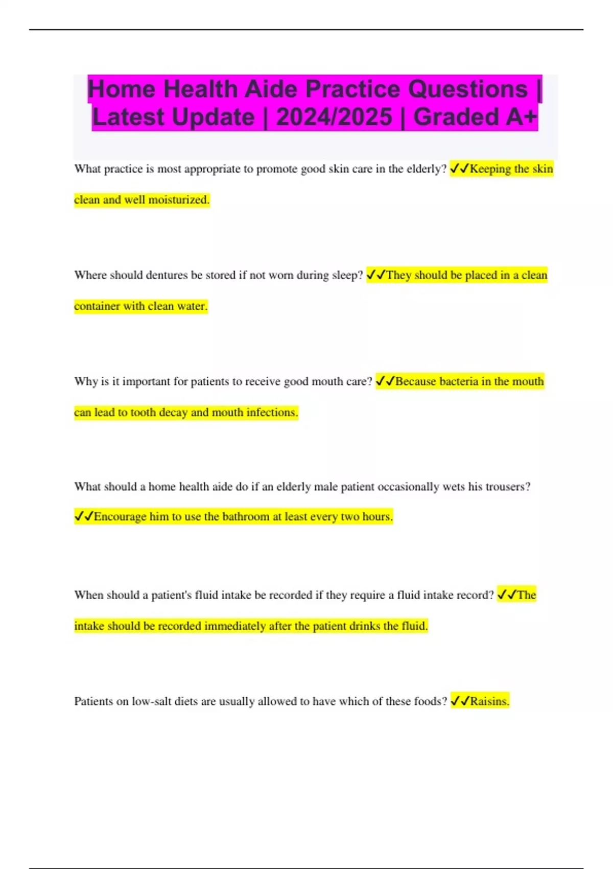 Home Health Aide Practice Questions | Latest Update | 2024/2025 | Graded A+