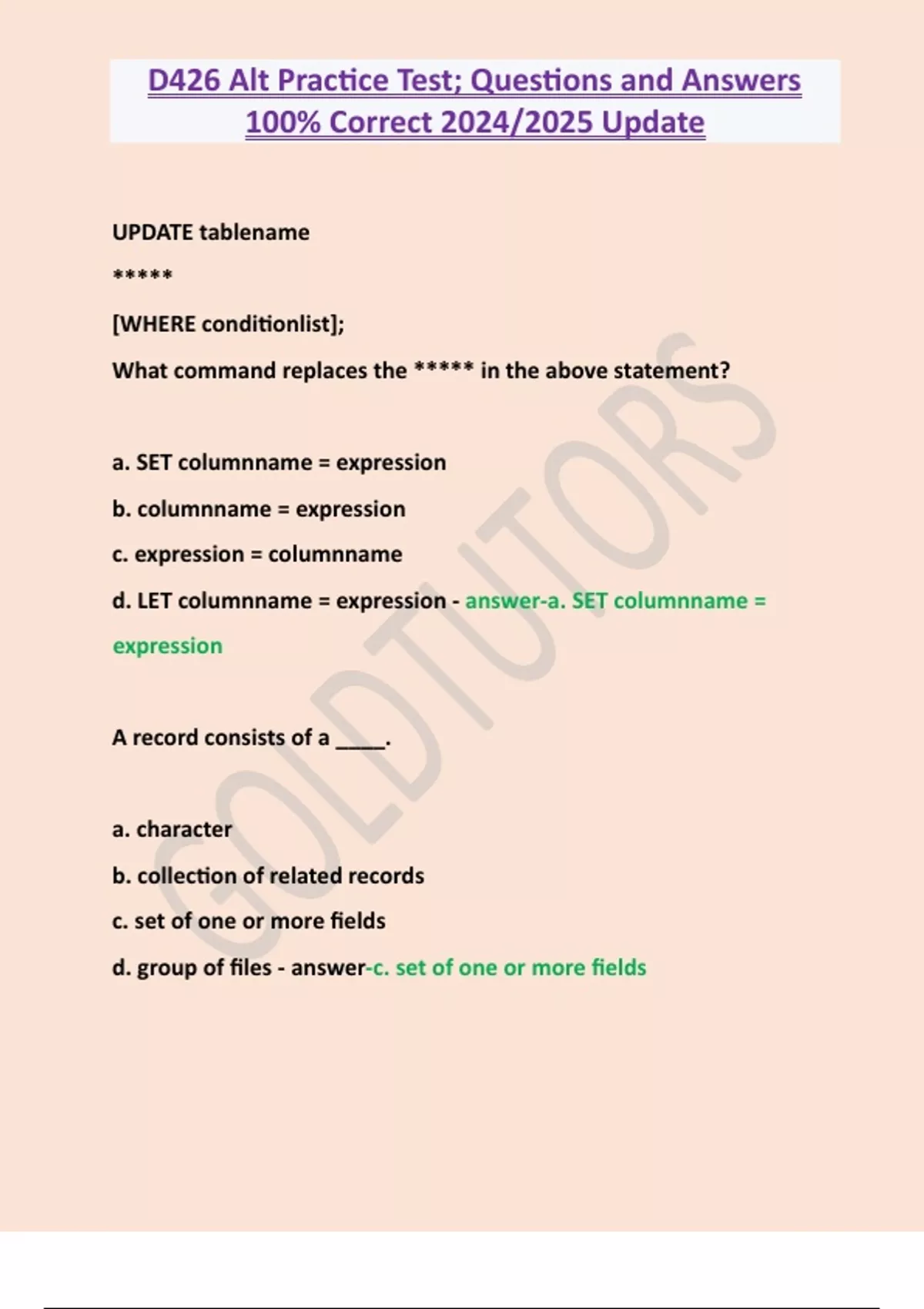 D426 Alt Practice Test; Questions and Answers 100% Correct 2024/2025 Update UPDATE tablename ***** [WHERE conditionlist]; What command replaces the ***** in the above statement? a. SET columnname = expression b. columnname = expression c. expression = columnname d. LET columnname = expression - answer-a. SET columnname = expression A record consists of a ____.
