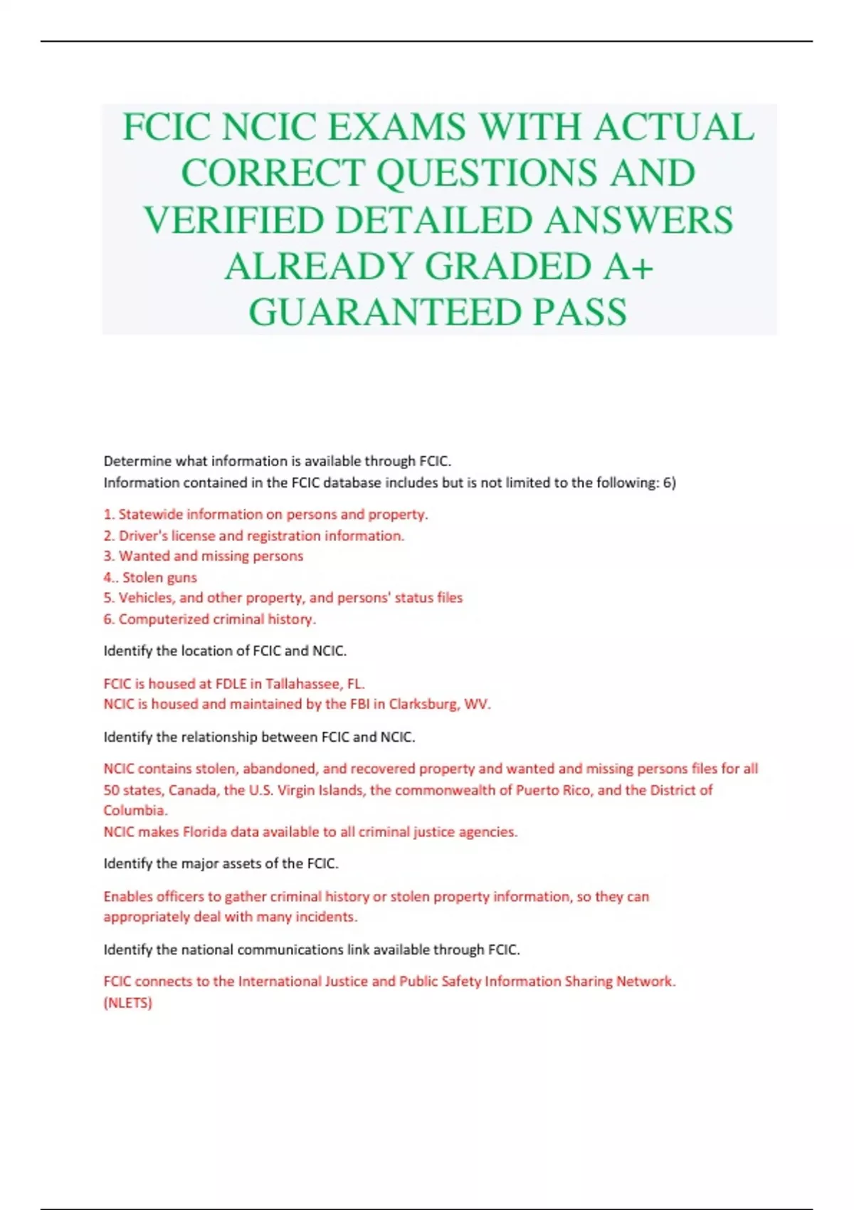 FCIC NCIC EXAMS WITH ACTUAL CORRECT QUESTIONS AND VERIFIED DETAILED ANSWERS ALREADY GRADED A+ GUARANTEED PASS