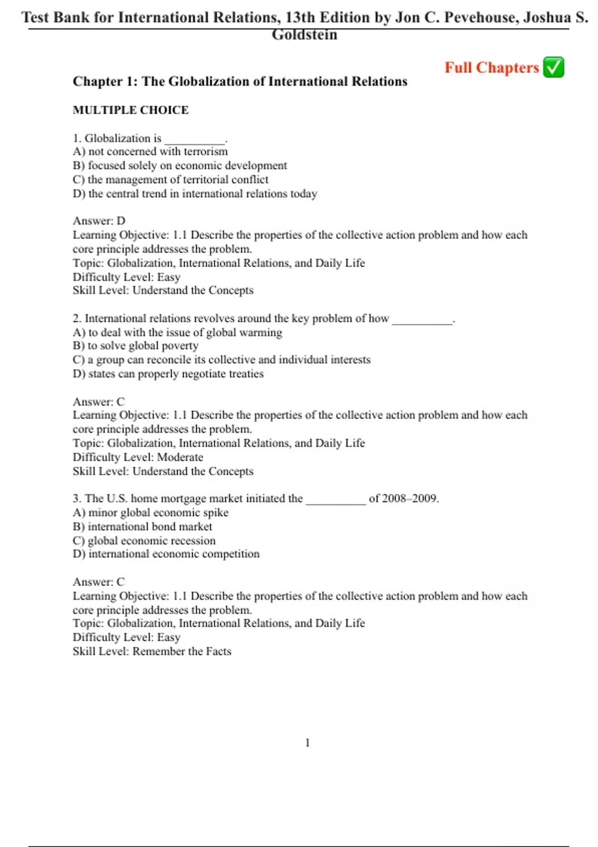 Test Bank for International Relations 13e 13th Edition by Jon C. Pevehouse, Joshua S. Goldstein, Sarah E. Kreps, dward D. Mansfield. Complete Chapters Chap 1 to 13 are included with answers. The Globalization of International Relations Realist Theories Liberal and Social Theories Foreign Policy International Conflict Military Force and Terrorism International Organizations, Law and Human Rights International Trade Global Finance and Business International Integration Environment and Population The North-South Gap International Development